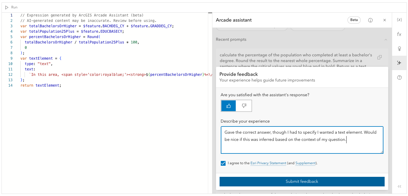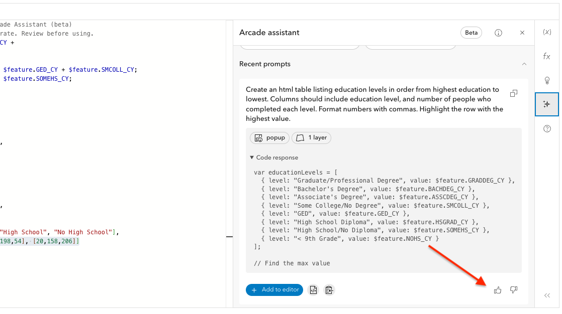 During the beta stage of this project (and beyond), your feedback will be crucial for helping us improve the experience for generating Arcade expressions from natural language. To submit feedback, use the thumbs up or thumbs down icon on the card displaying the assistant response to your question.