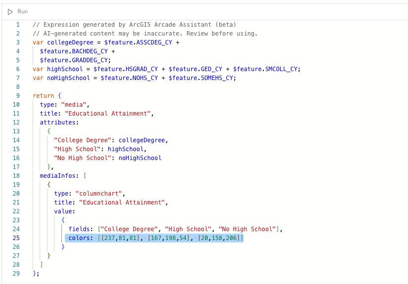 While the assistant does well in these scenarios, it won’t necessarily have all the context it needs in generating exactly what you want. For example, I would like the chart colors to match my map colors as the same categories exist there. The assistant doesn’t include the entire web map configuration in its context, so I would need to provide those colors to the assistant myself, or modify the expression after the fact.