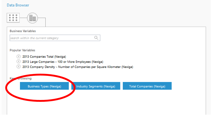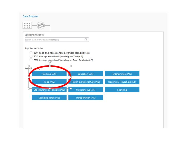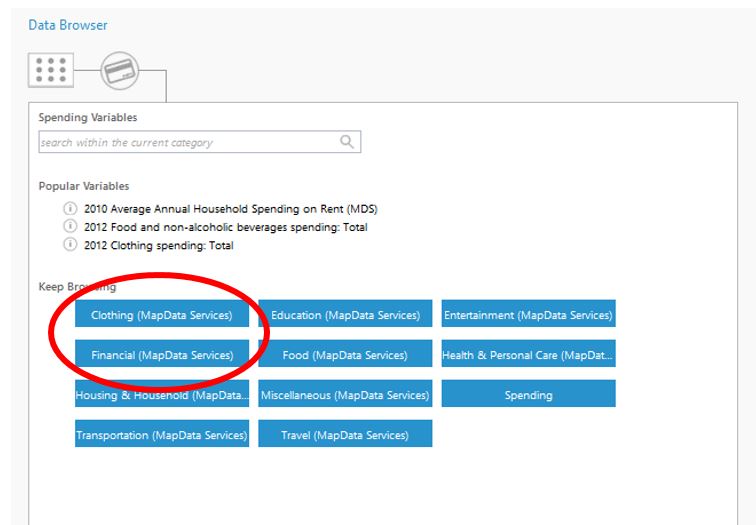 This database is available on the ArcGIS platform and through the GeoEnrichment services. Look for data collections that have “(MapData Services)” at the end like those circled below: