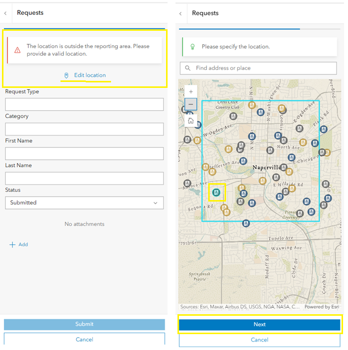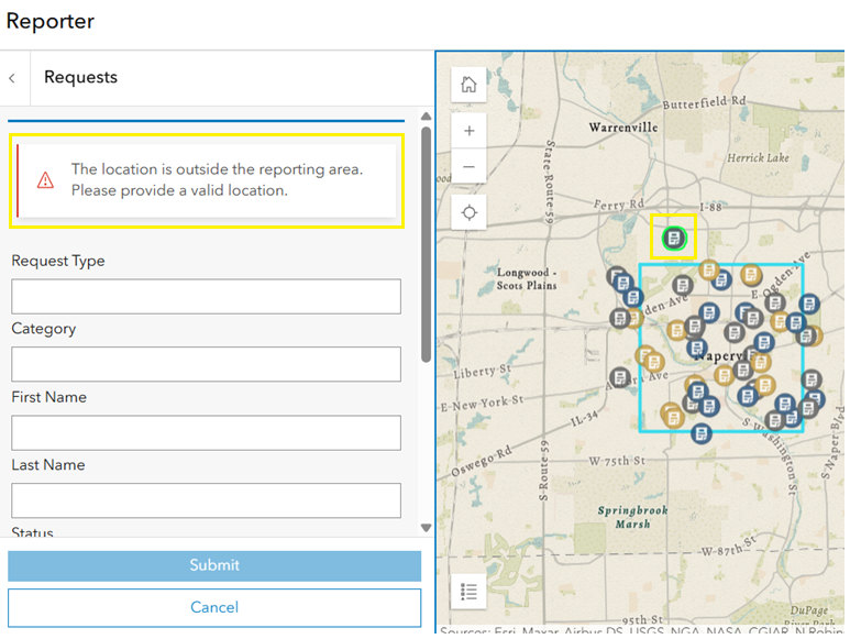 In the image below, the blue rectangle represents the report boundary. When a report’s location falls outside this boundary (highlighted in yellow), a warning message appears on the panel, and the submission is disabled until the location is corrected.