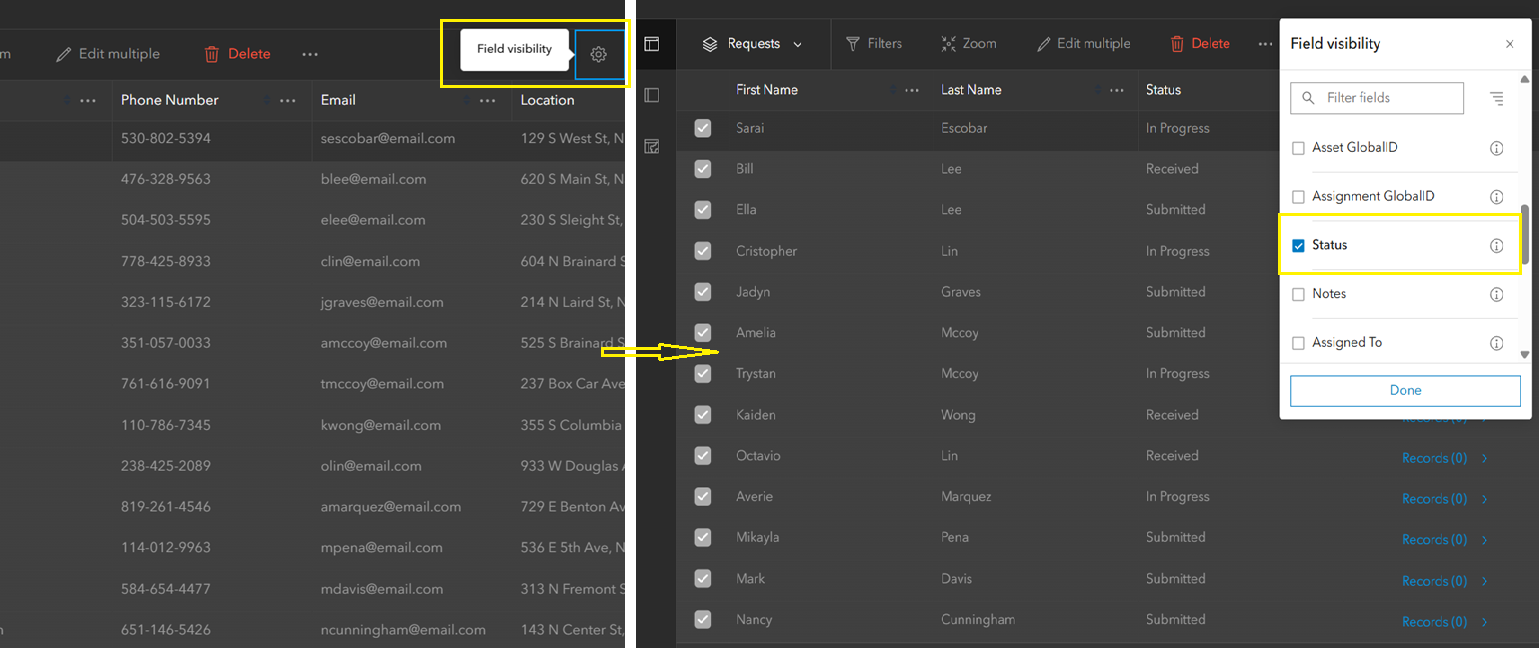 To simplify the view and show only important fields, the Field visibility button (gear icon shown in the image) is used. In this case, First Name, Last Name, Status, and Related Record are selected.