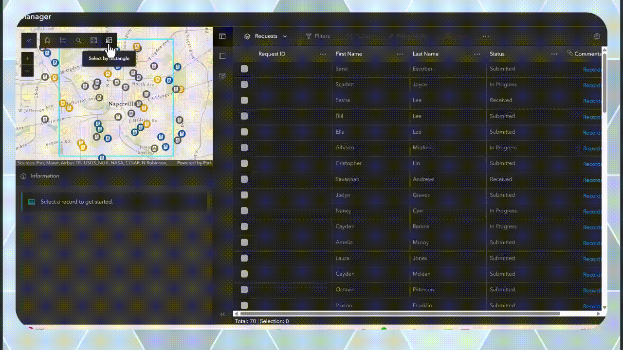 Once new bench suggestions are submitted through the Reporter app, the same data is accessed through the Manager Instant App—used here by planners to review, update, and follow up on submissions. While Manager is a flexible application that can support a wide range of workflows, in this scenario, it’s configured to streamline review and decision-making.
