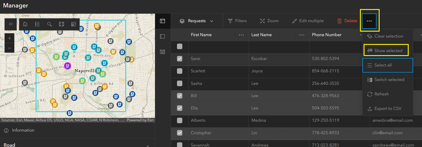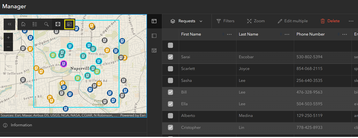 To focus on requests in a specific part of the map, the Select by rectangle tool can be used to quickly draw a box over the region of interest and capture all relevant features.