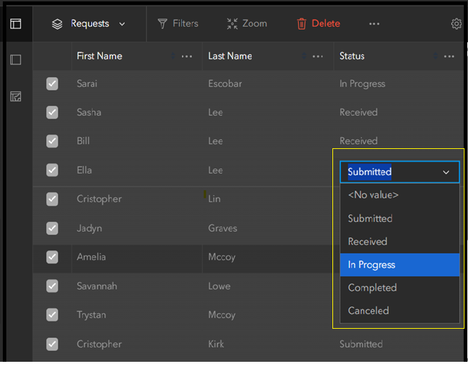 In this scenario, the goal is to update the Status field from Submitted to In Progress. Here’s how that process works in context.