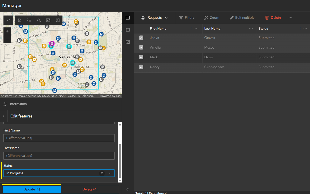 In the image below, selecting Edit multiple opens a popup panel in the bottom-left corner. The Status field is updated from Submitted to In Progress, and the Update (4) button is clicked—where the number in parentheses reflects the count of selected records. The panel also provides an option to delete multiple selected features.
