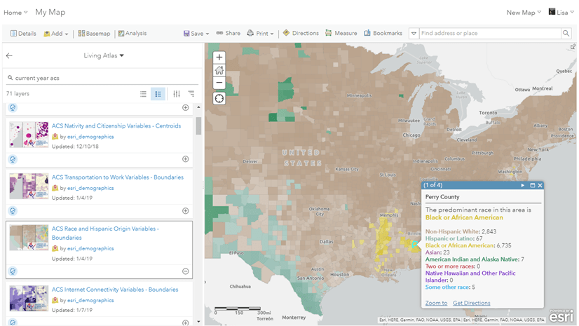 - ArcGIS Living Atlas of the World contains layers of the most current ACS 5-year estimates that are curated, free to use, and ready to go.