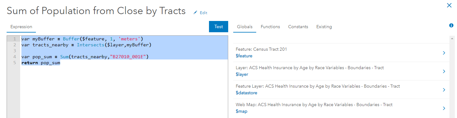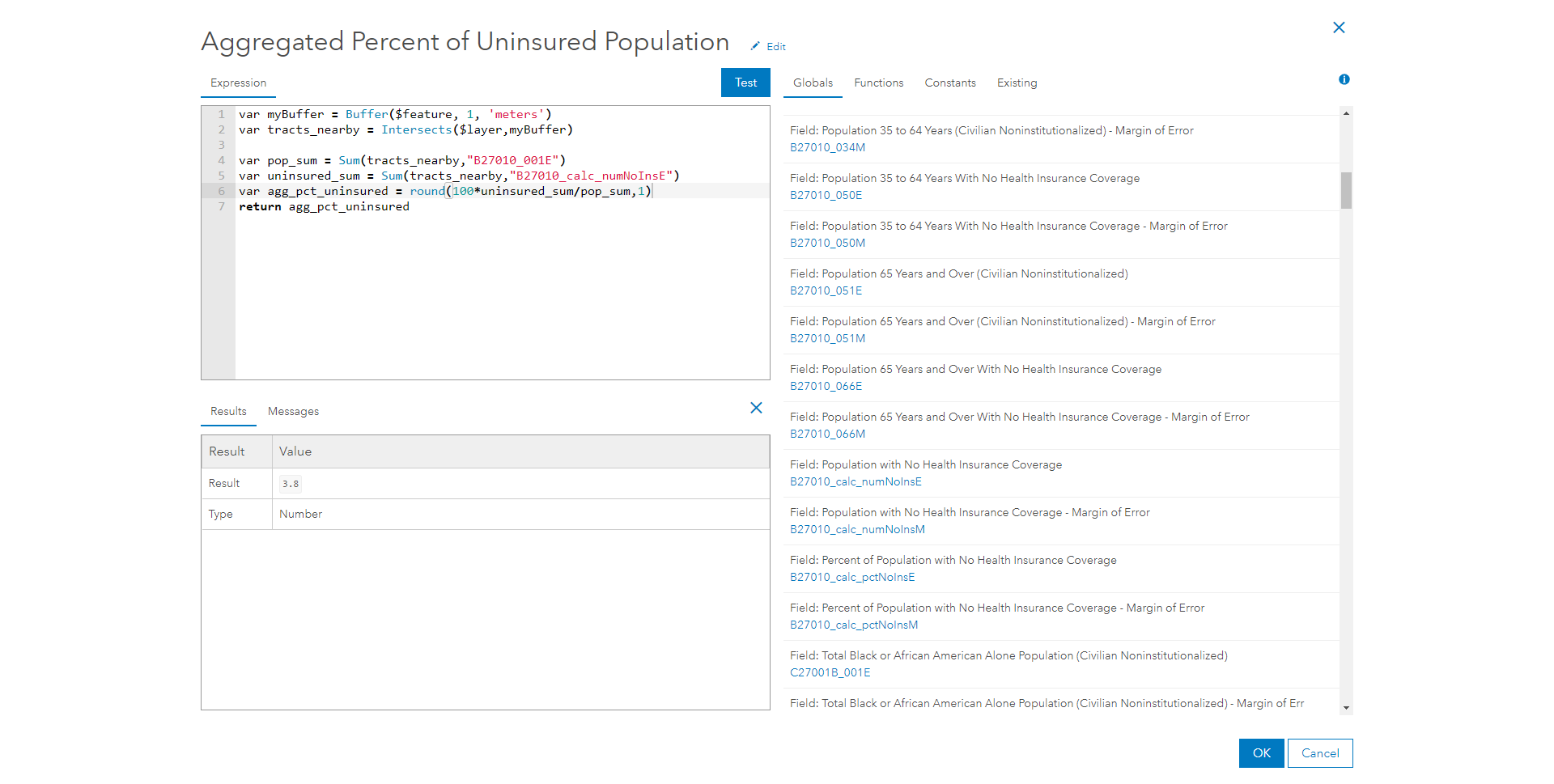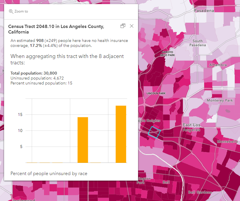 For instance, we often want to aggregate areas based off of an area of interest, such as a buffered area. When dealing with margins of errors in ACS, we may want to aggregate surrounding census tracts with one another in order to get values that are more reliable. The images below show the final pop-up, as well as the accompanying expression used to create this statement.