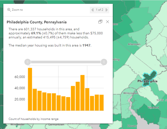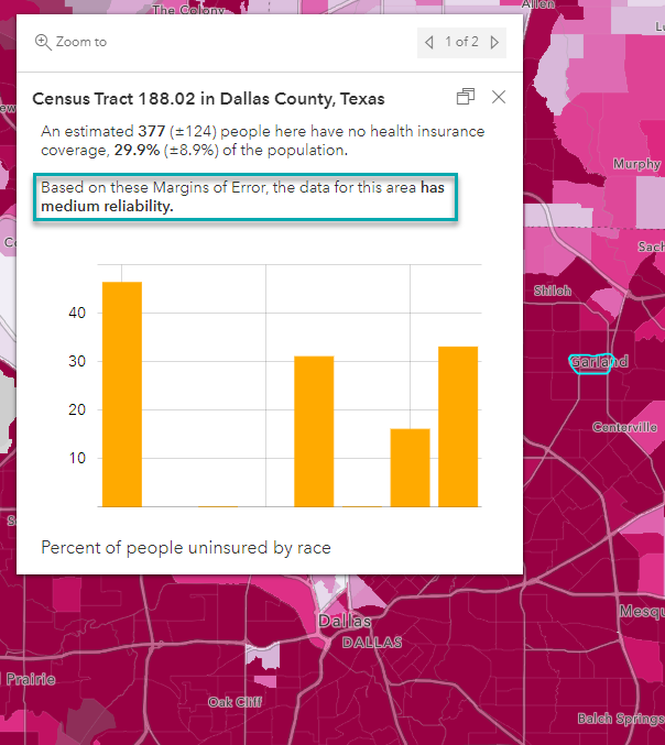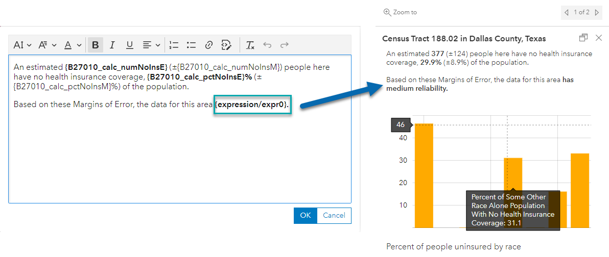 You can write logical statements in Arcade to determine whether or not a given census geography has reliable estimates for any given attribute by using the associated margin of error. The images below show the final pop-up, as well as the accompanying expression used to create this statement. The example below uses a When () function, which evaluates a series of conditional expressions until one evaluates to true.