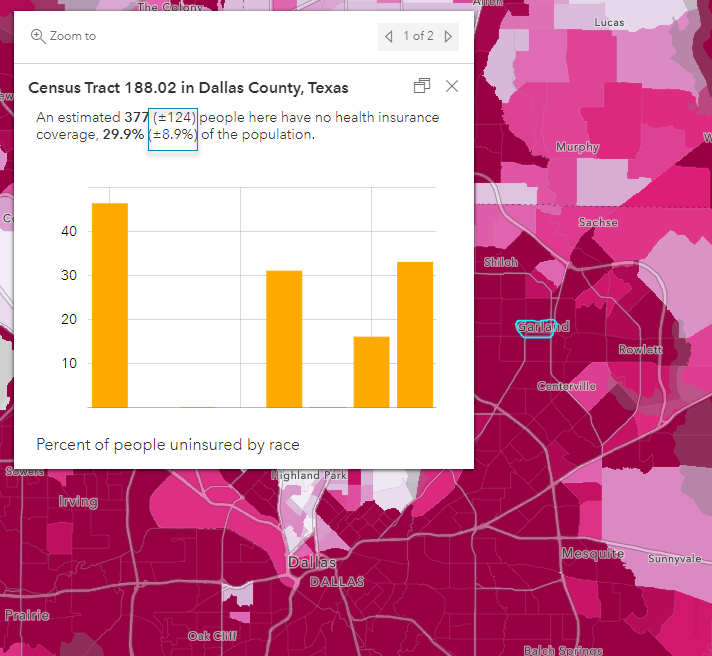 All of the ACS layers in Living Atlas of the World contain margins of error fields and are displayed in their pop-ups. For example, this pop-up from the ACS Health Insurance by Age by Race Variables layer shows the margin of error for those without health insurance.