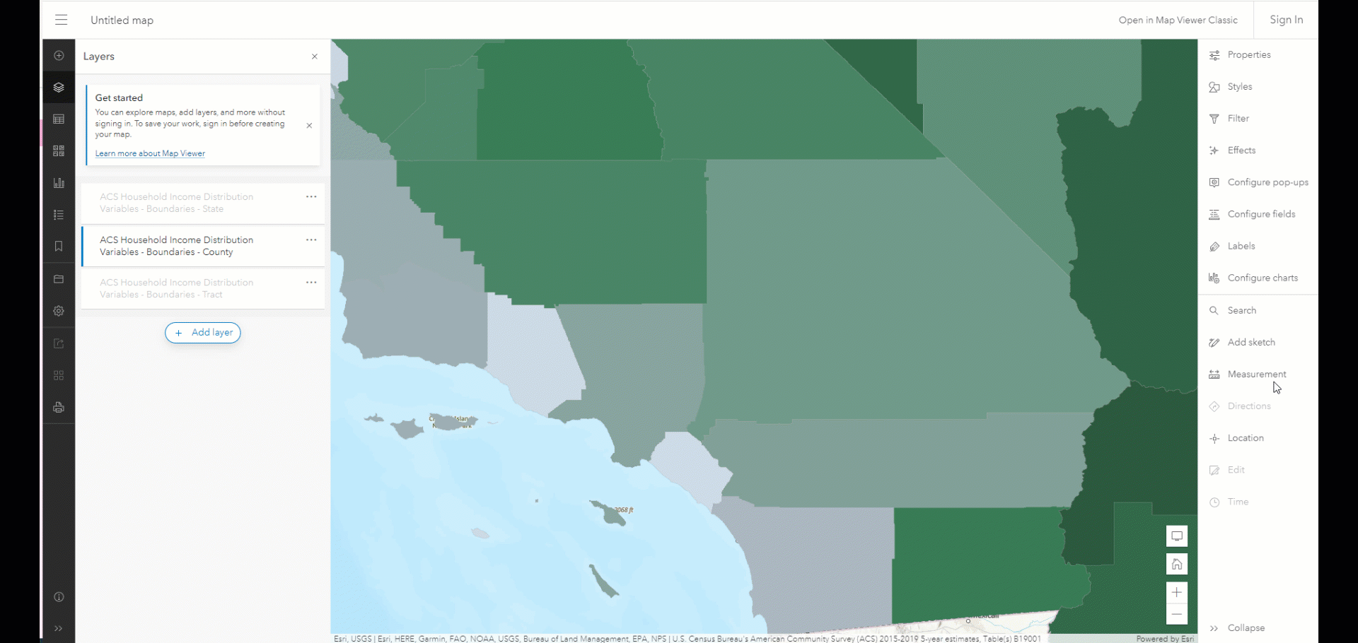 A lot of valuable fields are given in ACS data, but often times you may want to combine fields and construct new values to map. For instance, if you would like to map a percentage of households whose income was below $50,000, you could use the ACS Household Income Distribution Variables layer in Living Atlas of the World and Arcade to calculate this attribute on-the-fly.
