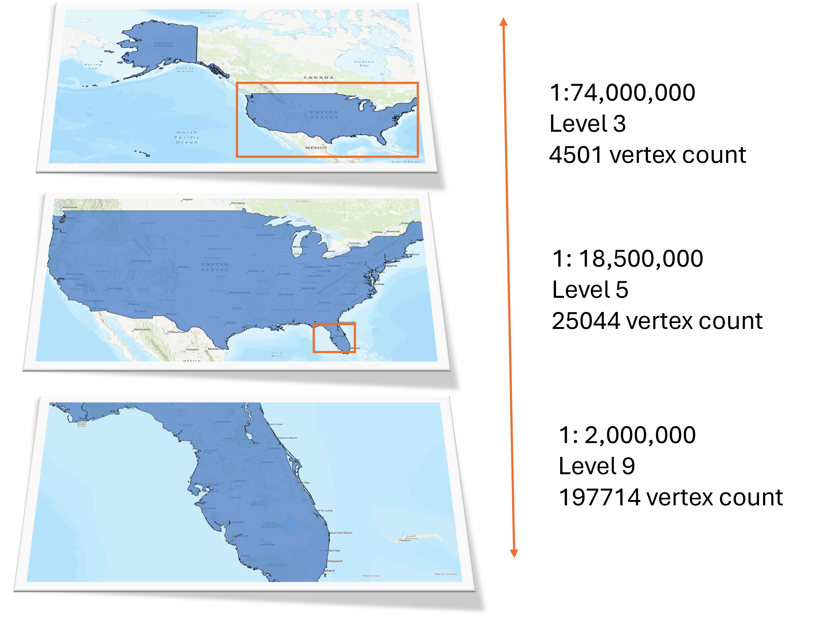 - 1M Vertices: The maximum display level limit is set at 1 million vertices. When the geometry has fewer than 1 million vertices, the Optimize Layer Drawing feature will query the original geometry if you zoom in beyond the maximum level of optimized geometries. However, if the original geometry exceeds 1 million vertices, the “maxAllowableDisplayLevel” geometry will be the last level to use instead of the original. This information is defined in the “multiScaleGeometryInfo” when building the optimized geometry and cannot be altered.