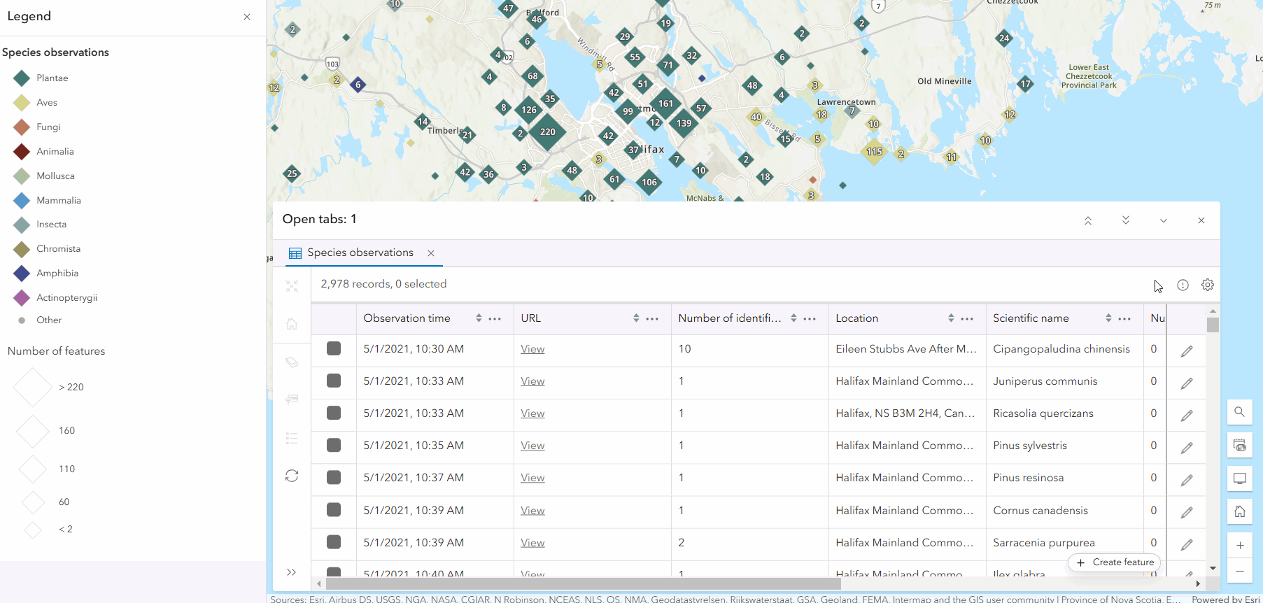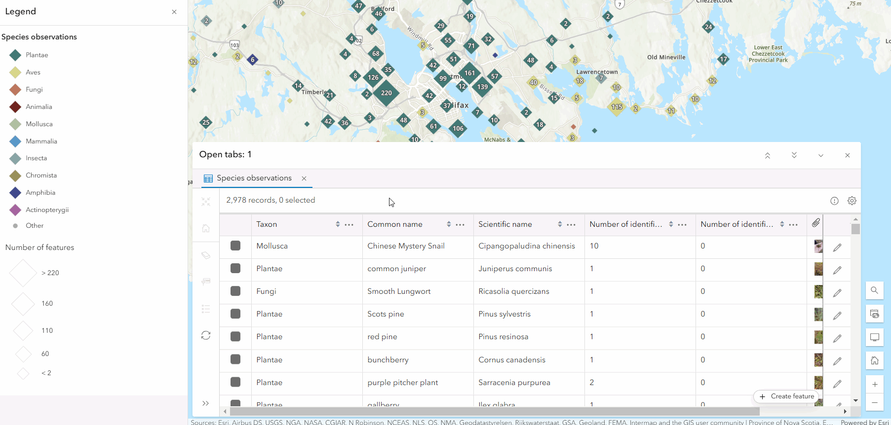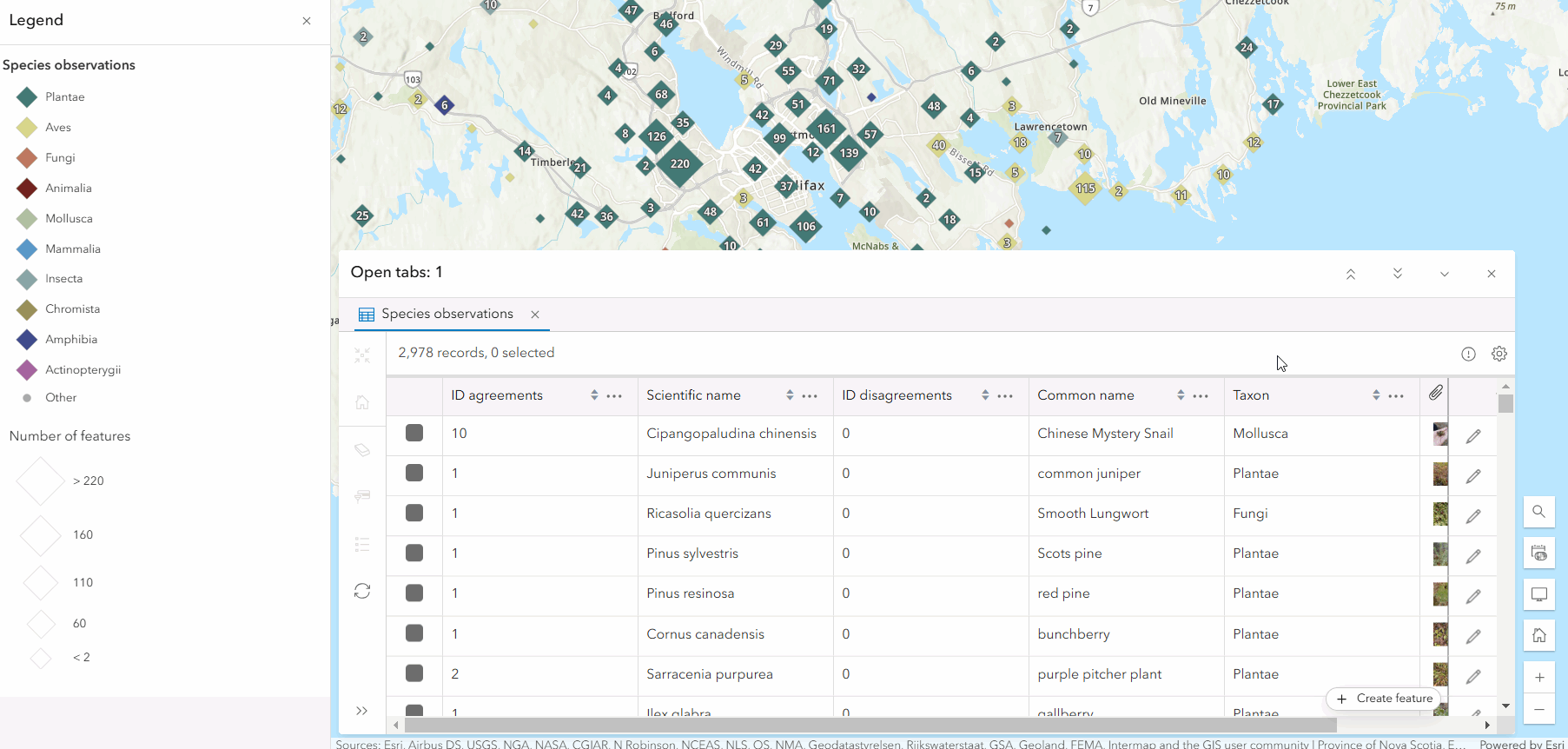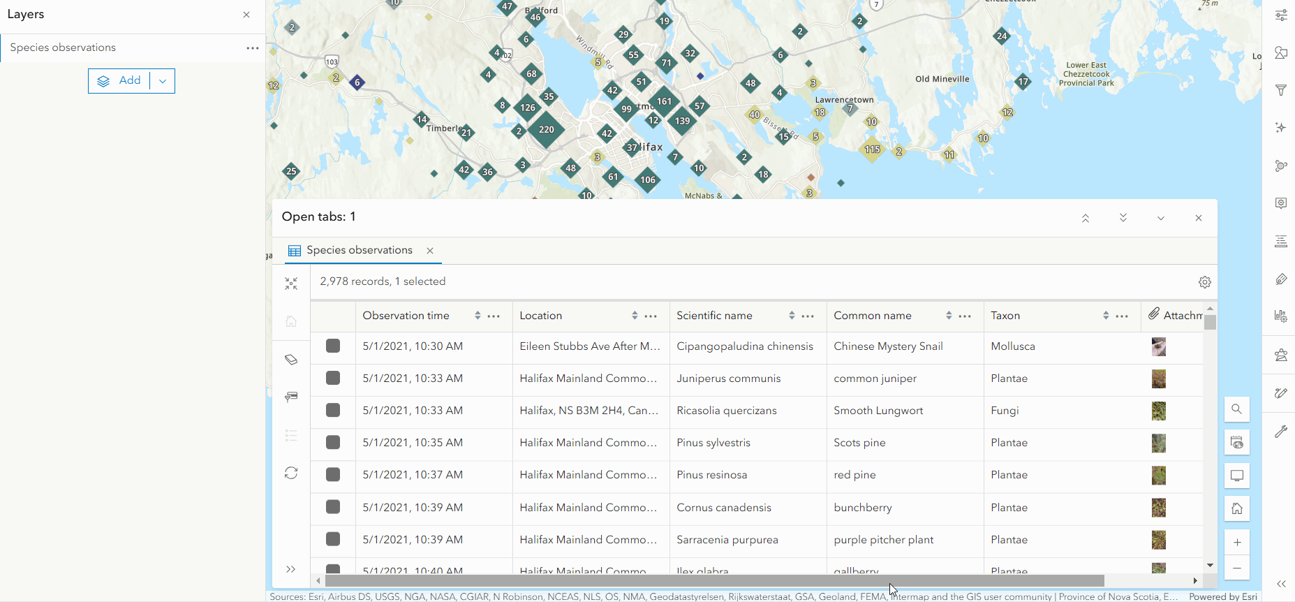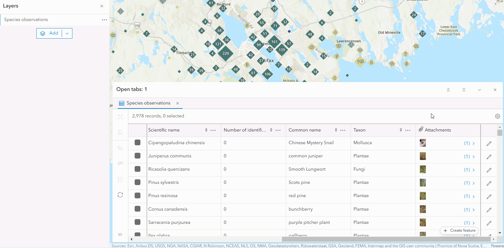 Configuring column visibility ensures that your audience has the information they need to understand the dataset and draw conclusions. Column visibility can be set on fields, attachment columns, and related record columns. In the species observations map below, I’m refining the attribute table to match the map theme by only including species identification information, like species names, identification agreement/disagreement votes, and attachments.