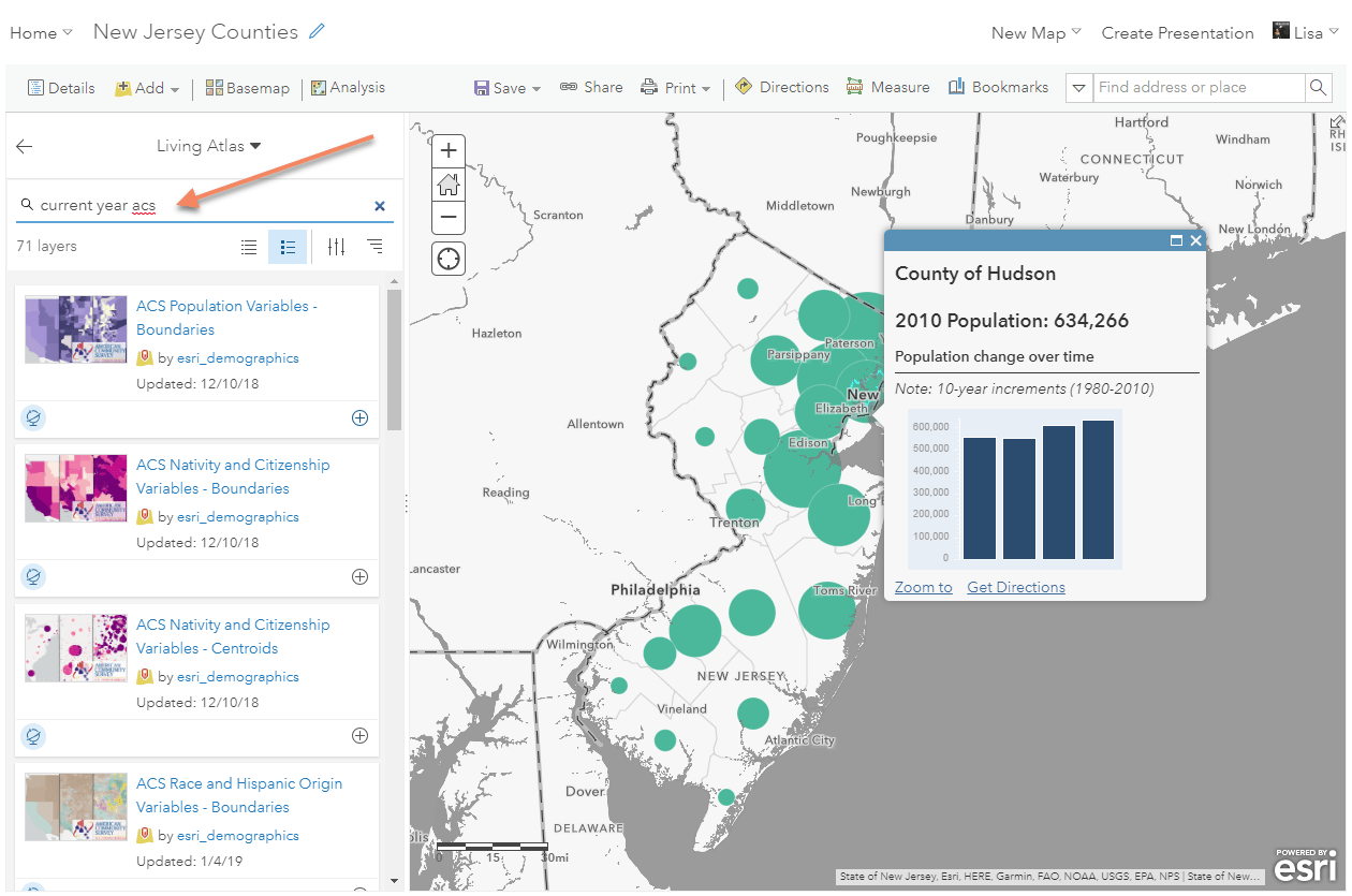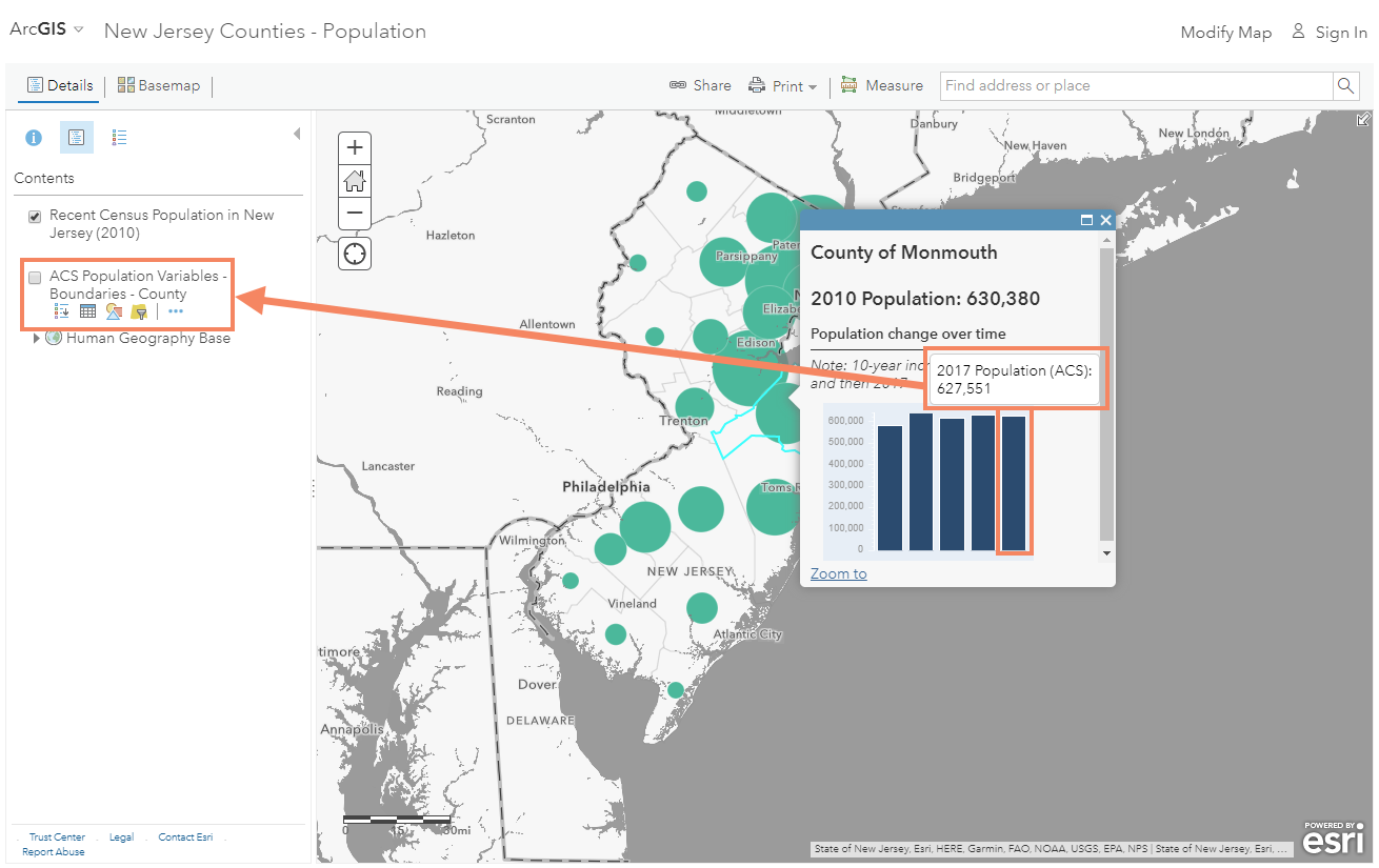 In this example, I have a map of counties in New Jersey where I am mapping population from the 2010 decennial Census. This is my main layer. The pop-up contains population figures from previous Censuses since 1980. I’d like to see where this trend is headed as the 2020 Census approaches. The American Community Survey (ACS) branch of the US Census Bureau offers the most recent population estimates for the United States, and this data has been recently added to the Living Atlas of the World. I will pull the most recent population figure into my main layer’s pop-up using arcade and a layer from the Living Atlas. Below is what my pop-up will look like once I add the new value from the contextual layer. The data value for the new bar in the chart is coming from the Living Atlas layer in the map.