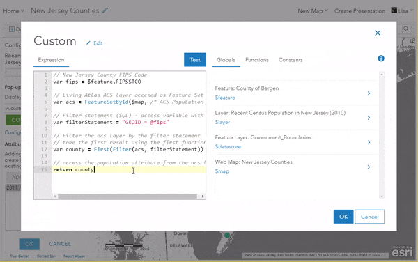 Within the pop-up configuration for the New Jersey layer, I’ll build a new arcade expression which will act like any other data attribute, and it will store the population value I query from the ACS layer.