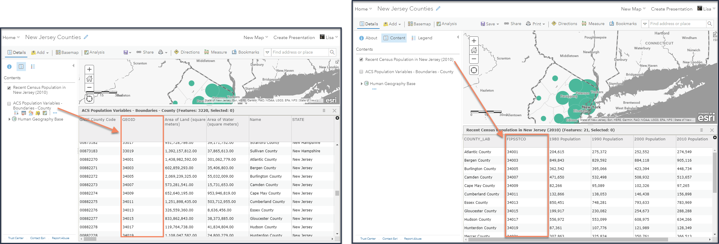 When I open the New Jersey table and the ACS table, I can see a common FIPS code field for the county between them. In the New Jersey layer, this is called FIPSSTCO and in the ACS layer, its called GEOID. These two fields will be used to create my attribute filter.