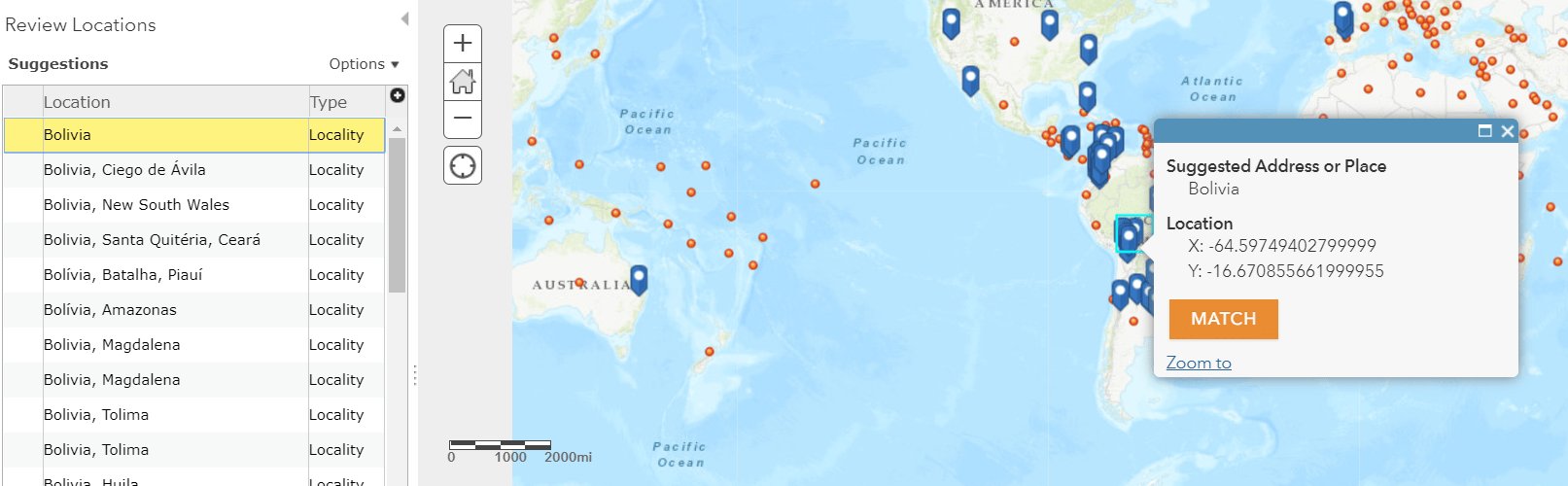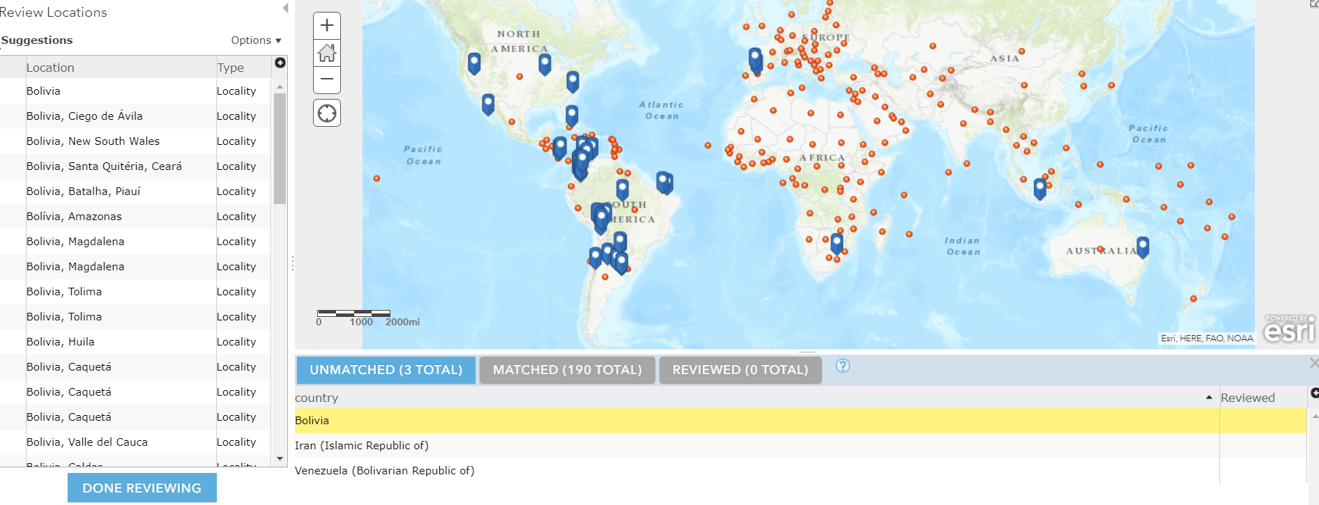 I’ll start with Bolivia. Clicking on the record allows me to edit the text here. I’ll change the text to simply “Bolivia” instead of “Bolivia (Plurinational Republic of)” – which brings up a whole list of suggested point locations for me to review: