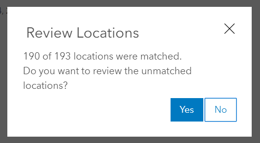 Once published, a dialog box appears that tells you how many of your locations matched, and you’ll get a chance to review any unmatched cases. In my case, I have three unmatched countries: