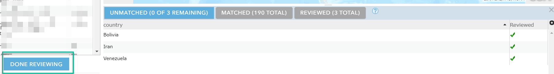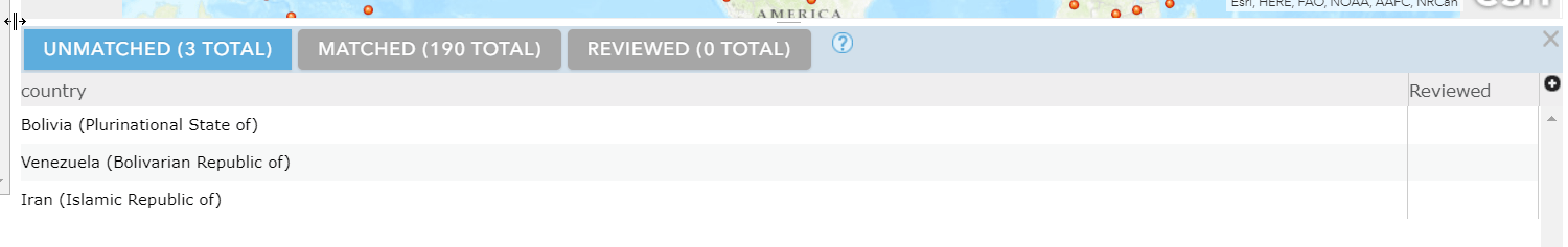 After clicking Yes to review my unmatched records, I’m taken directly to the Map Viewer with a checklist of these three for me to review. Curious which three didn’t match? It was Bolivia, Venezuela, and Iran: