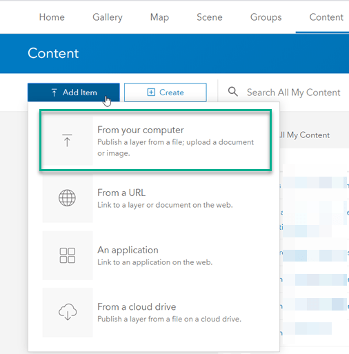 I’ve prepared my spreadsheet, and I’m signed in to ArcGIS Online. I start by adding this item from my computer to my ArcGIS Online Content.