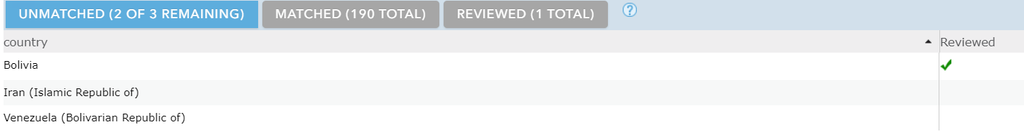 I went through this same process with the other two unmatched records: Venezuela and Iran. From here, I can either review matched cases in a similar way by clicking on the Matched tab and make any necessary changes, or I can confirm that I am done reviewing.