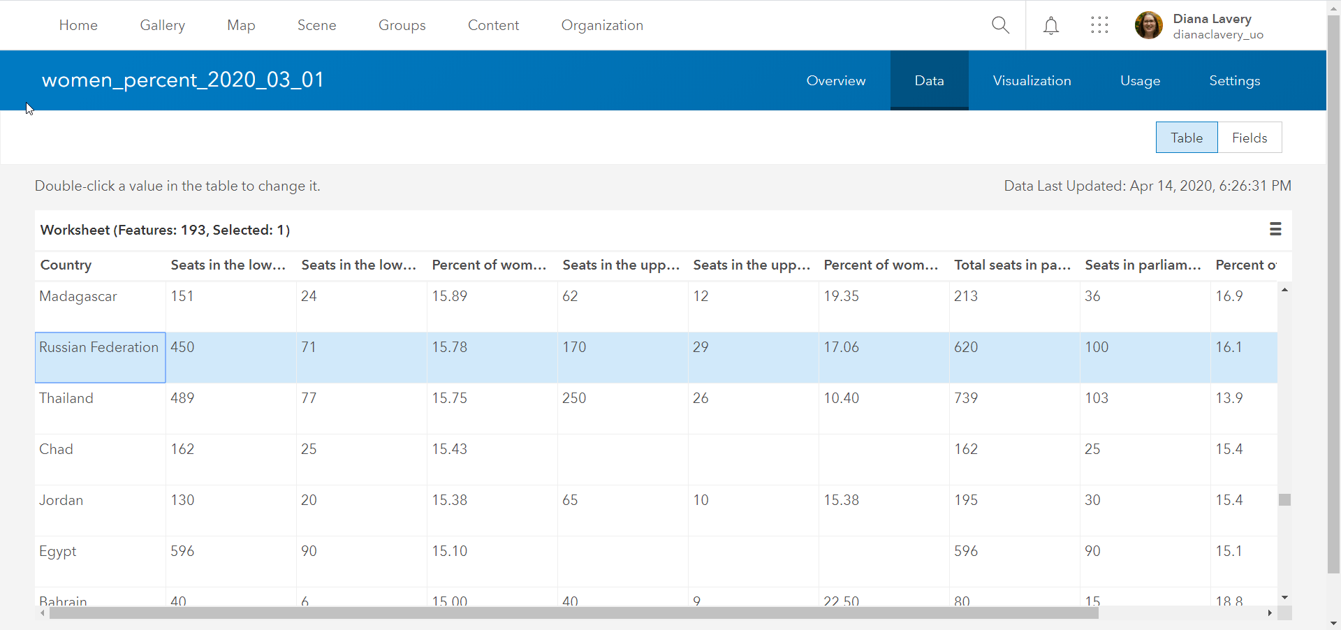 I like to do this from the layer’s metadata found in the Item Details page under the Data tab. From here, I can add understandable field aliases, long descriptions, and attribute types to each attribute. This will help me as well as others who might be working with this layer. I can also edit the tabular data itself. I’ll change this country name to “Russia”: