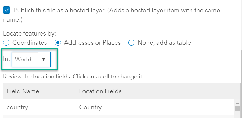 ArcGIS Online picks up on the fact that this is a table, and gives me the option to publish as a hosted feature layer as the default option. It scans my data and sees that there are no coordinates, no addresses, but that I do have a field called country, so it suggests that I match on this field. If you have addresses in the United States address format, you’d want the “In” dropdown option to say “United States” (or whatever country your addresses or places are in). I’ll change the dropdown option to World rather than United States since I’m working with a table of countries.