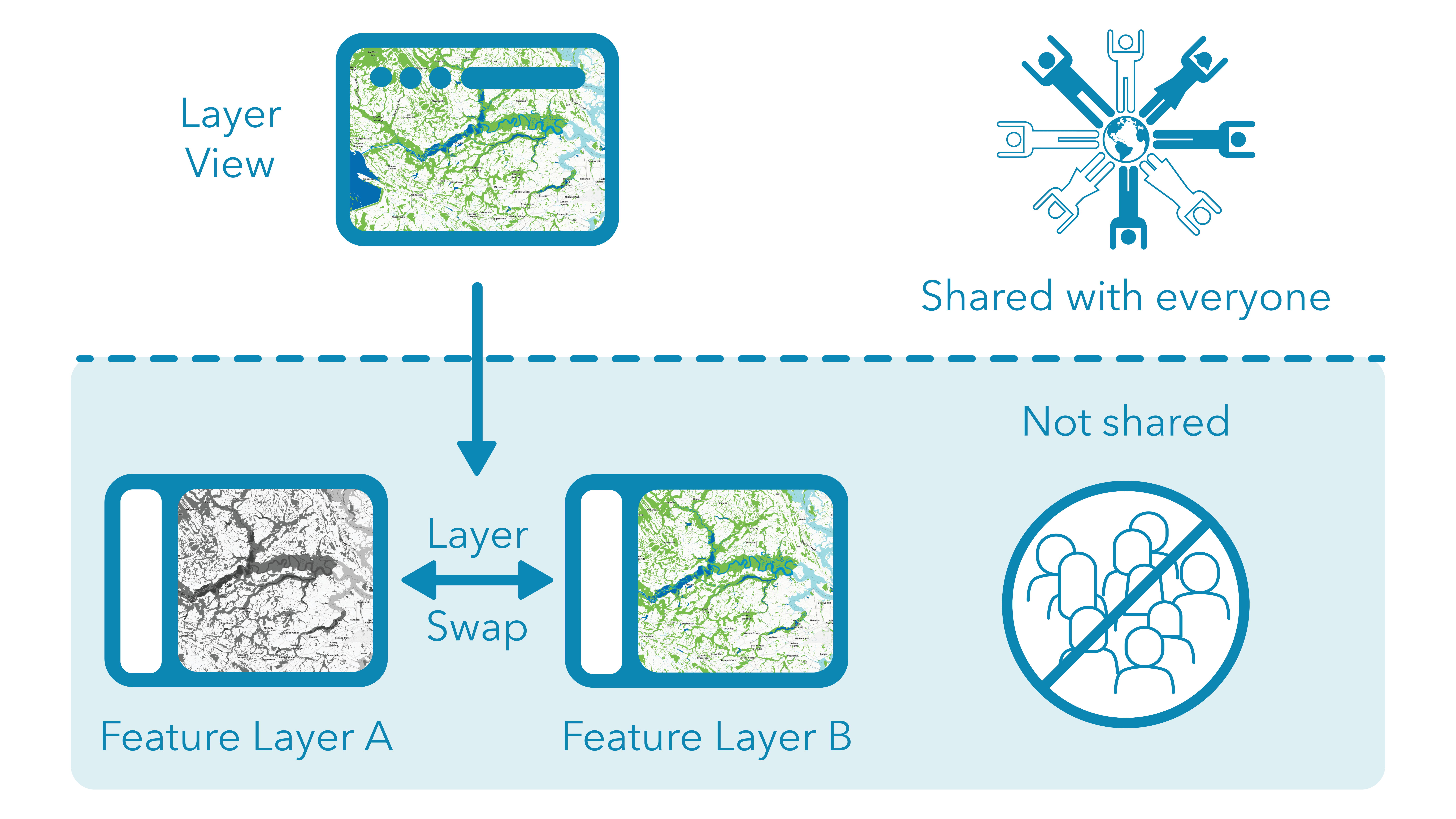 This simple architecture of a shared layer view and a hidden feature layer enables us to do updates out of sight from our users and make updates with minimal impacts. ArcGIS Online provides a simple process to switch which feature layer a layer view uses. This layer swap is a powerful tool that will make your work easier.