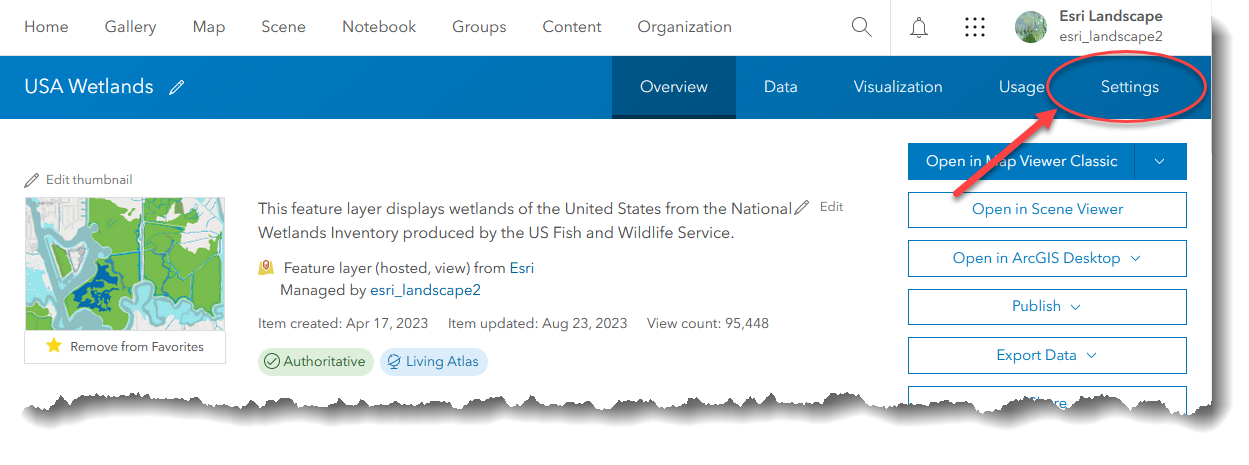 To swap layers, first click the settings tab, on the upper right of the layer view’s item page