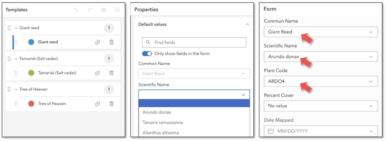 Let’s say we’re mapping invasive plant locations. The attributes for our plants layer include fields like Common Name, Scientific Name, and Plant Code. These fields are connected, meaning the value in one field drives the value in another. For example, one of the plants we’re mapping is commonly known as Giant reed. The scientific name for Giant reed is always Arundo donax. So, instead of asking data collectors to enter the scientific name each time (imagine the typos!), we can set it up to fill in automatically. This is where feature templates come in. Templates let us predefine default values for different categories of features, like different species of plants. Let’s take a look at how to set this up in Map Viewer.