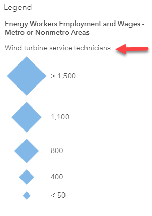 They are visible in the auto-generated legend for the attribute you’re mapping. Here I’m mapping the count of employees who are wind turbine service technicians, attribute field tot_emp_499051. Nobody wants a legend that says “tot_emp_499051” when it can say “wind turbine service technicians” instead: