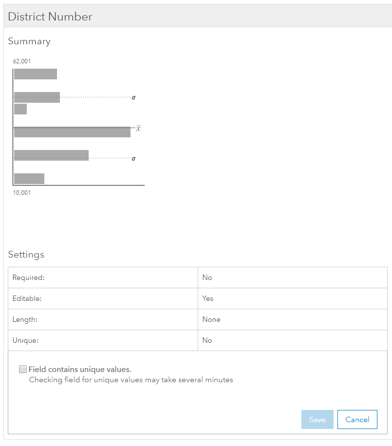 Many of you have your own ID fields that are unique and reflect the naming standards within your organization—for example, an Electoral District, Parcel ID, Asset ID, or anything that uniquely identifies the feature . Now you can use that field as the match field when updating existing data. To take advantage of this feature, you first need to enable the setting on the field to verify that the existing data for that field in the layer is unique.