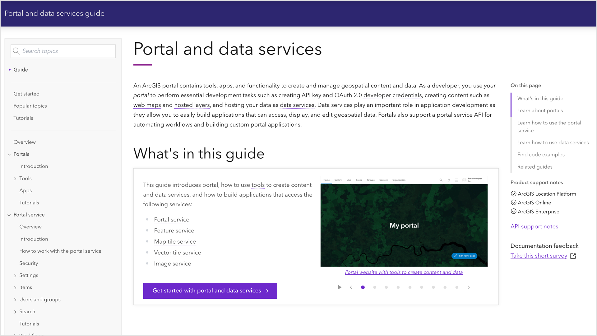 If you are new to our guide, it provides information about what a portal is, including its capabilities, the portal service (the backbone of the portal), and data services you can create with a portal. The guide contains topics, how-to’s, code examples in various APIs, and tutorials.