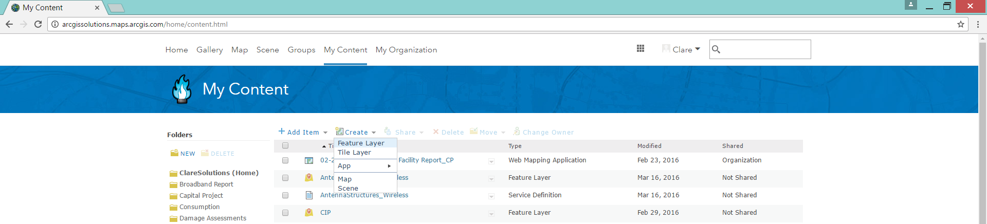 To get started, sign into your ArcGIS Online organizational account and browse to My Content. From this page, you will see the Create tab which allows you to create a new app, map, scene, tile layer, or – in this example – feature layer. When creating a new hosted feature service in ArcGIS Online, you have three options. To create a layer from an existing layer, from a URL, or from a template.