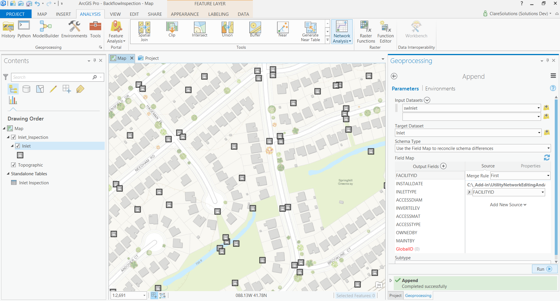 Those that have existing asset data can load their data into a hosted feature layer using ArcGIS Pro. To load data to a hosted feature layer, sign into ArcGIS Pro and create a new project. Create a map and add your hosted feature service to the map. Browse to the Analysis tab, and open the Tools. Browse through the toolboxes or search for the Append tool. Then append your asset data to the asset layer in your service.