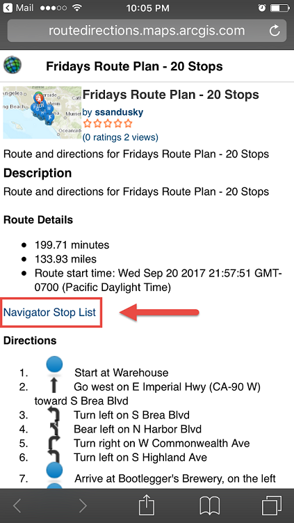 You can then view the route layer item on your mobile device, and click the “Navigator Stop List” link. This will automatically load all your route’s stops into Navigator.