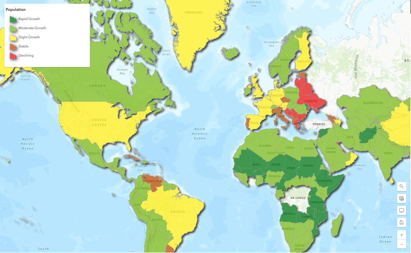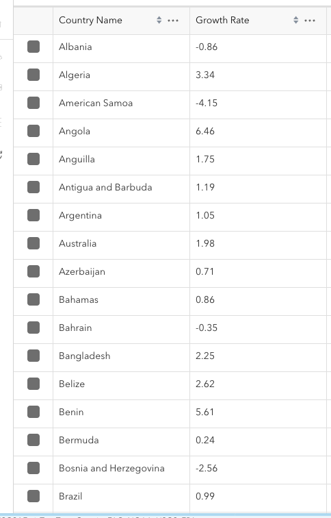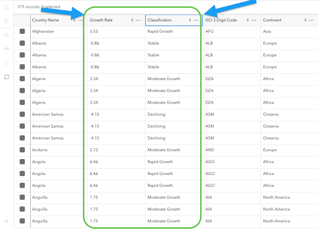 Now our two new fields, Growth Rate and Classification, have been correctly populated with the help of the assistant. Let’s symbolize based on the classification field to help visually clarify what countries are growing the fastest or slowest.