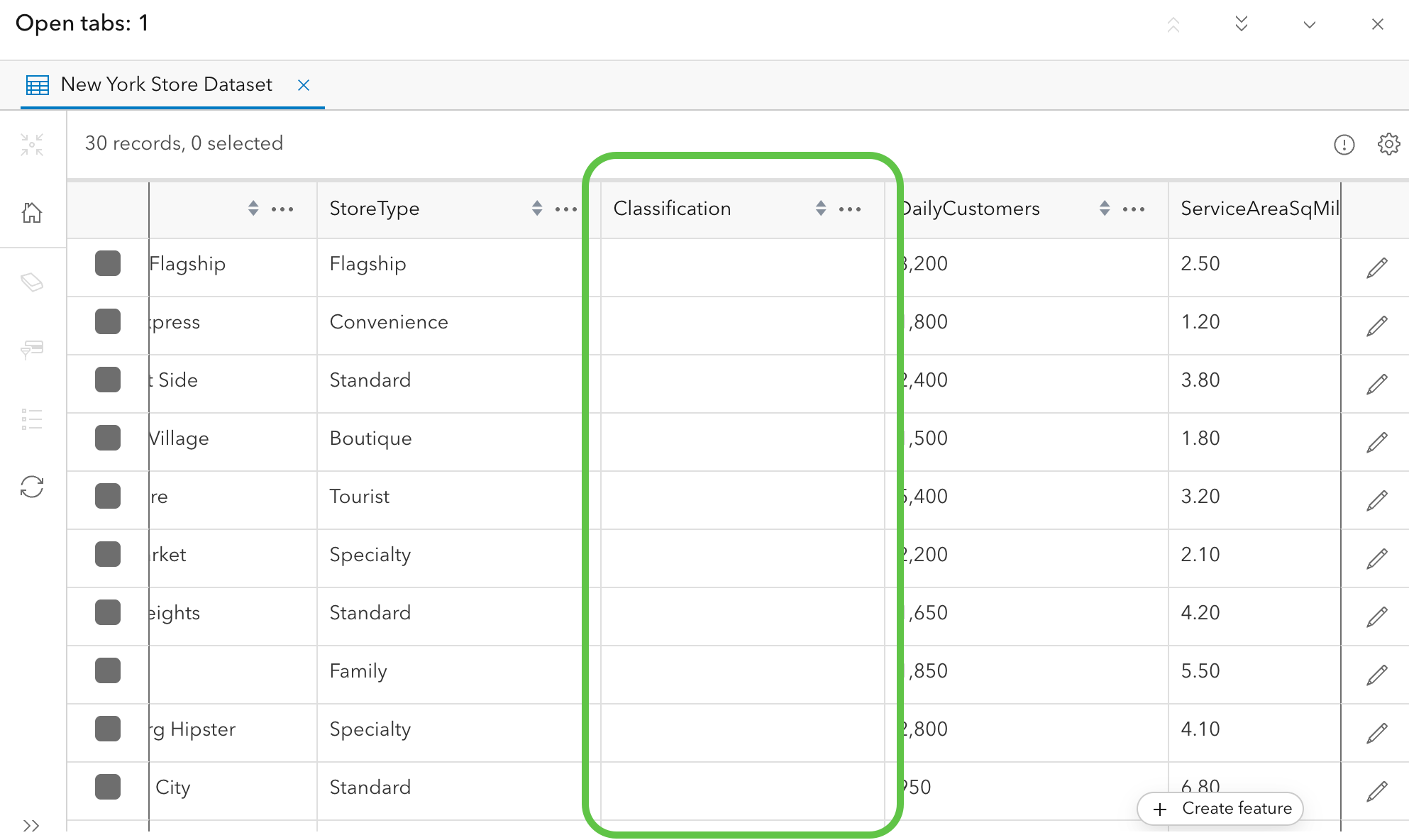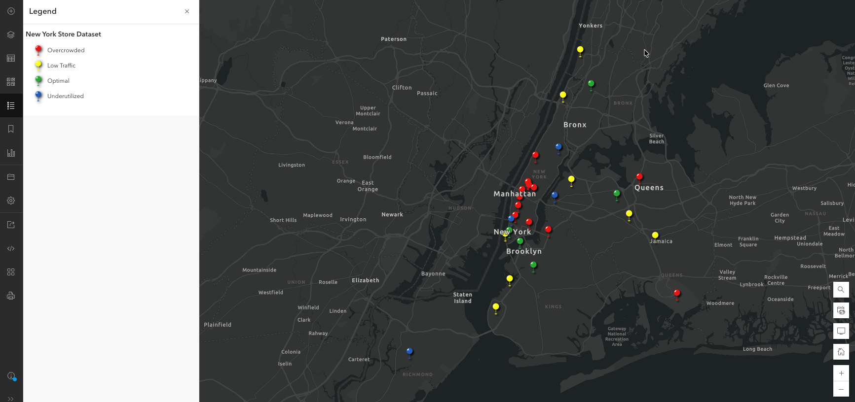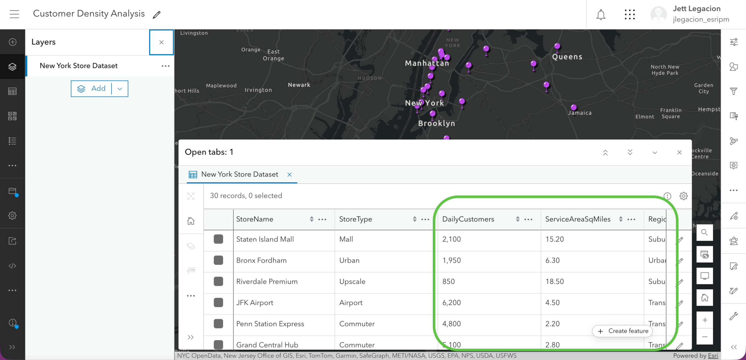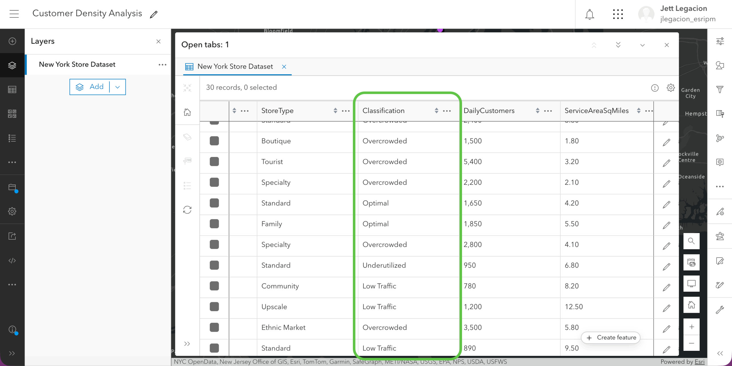 In Map Viewer, you have data (fictional for demo purposes only) that showcases the number of customers a particular unit gets daily and how much area it covers. Let’s create a new field to first discover the customer density, and second determine if the unit is “overcrowded”, “optimal”, or “underutilized”.