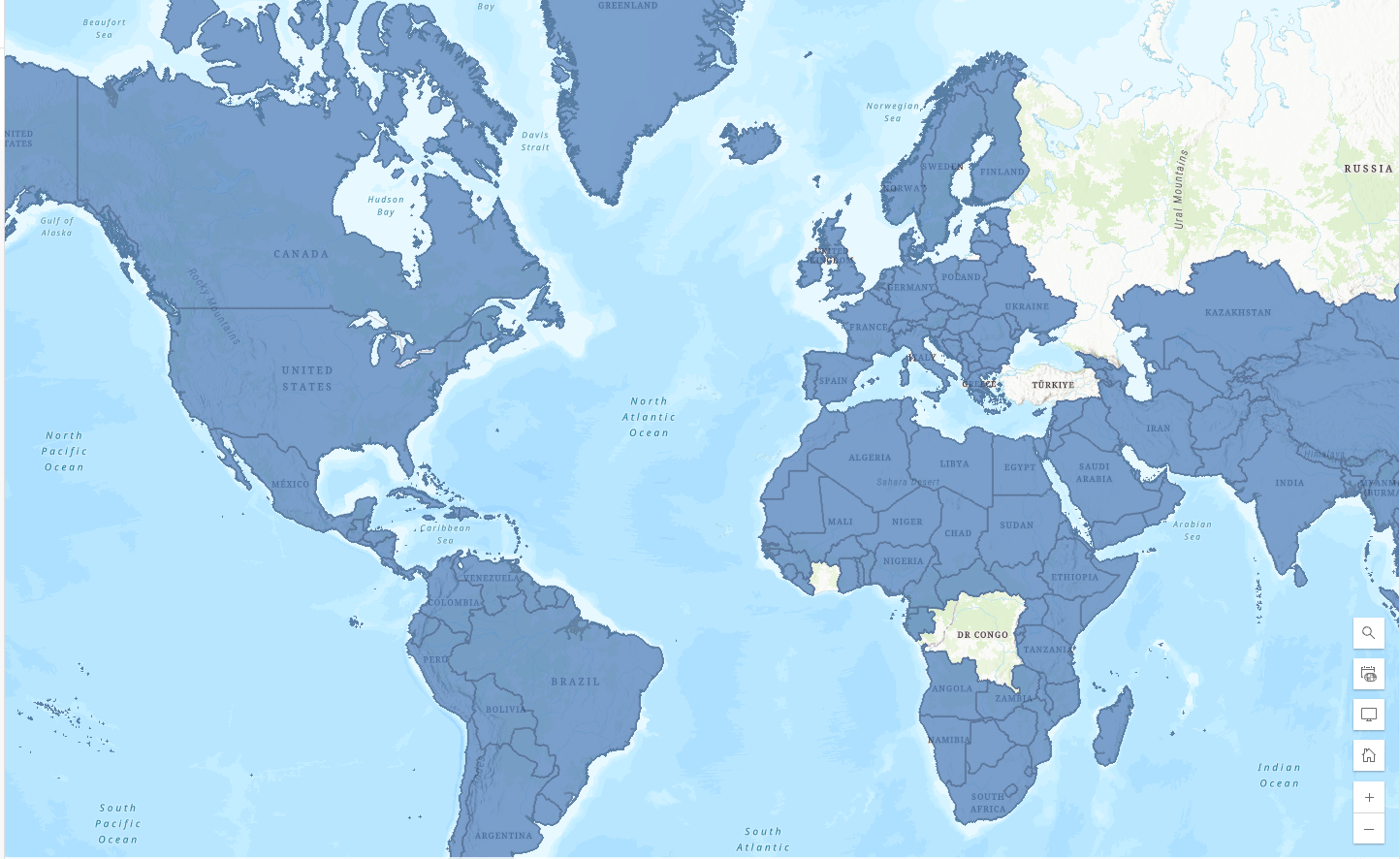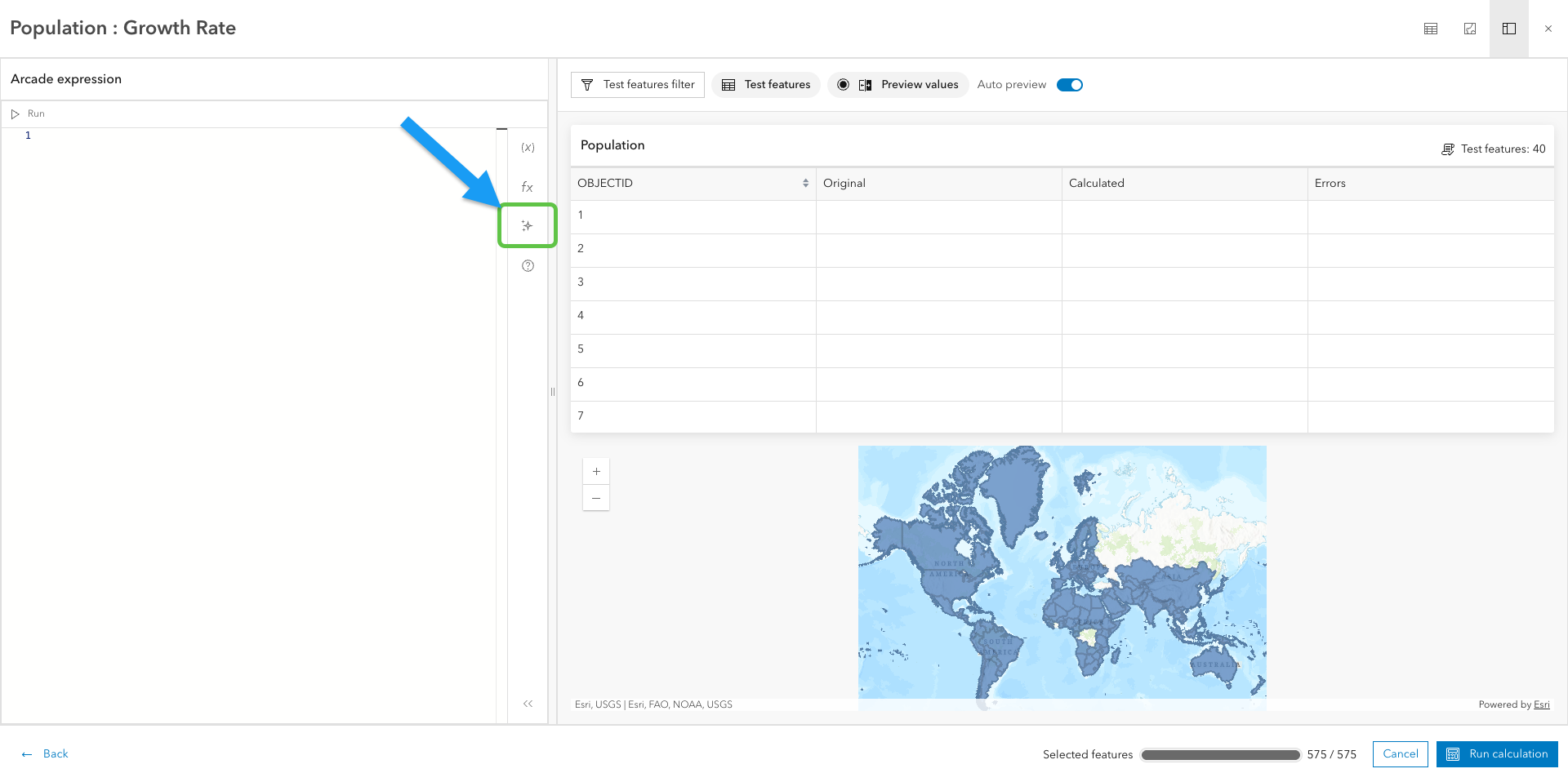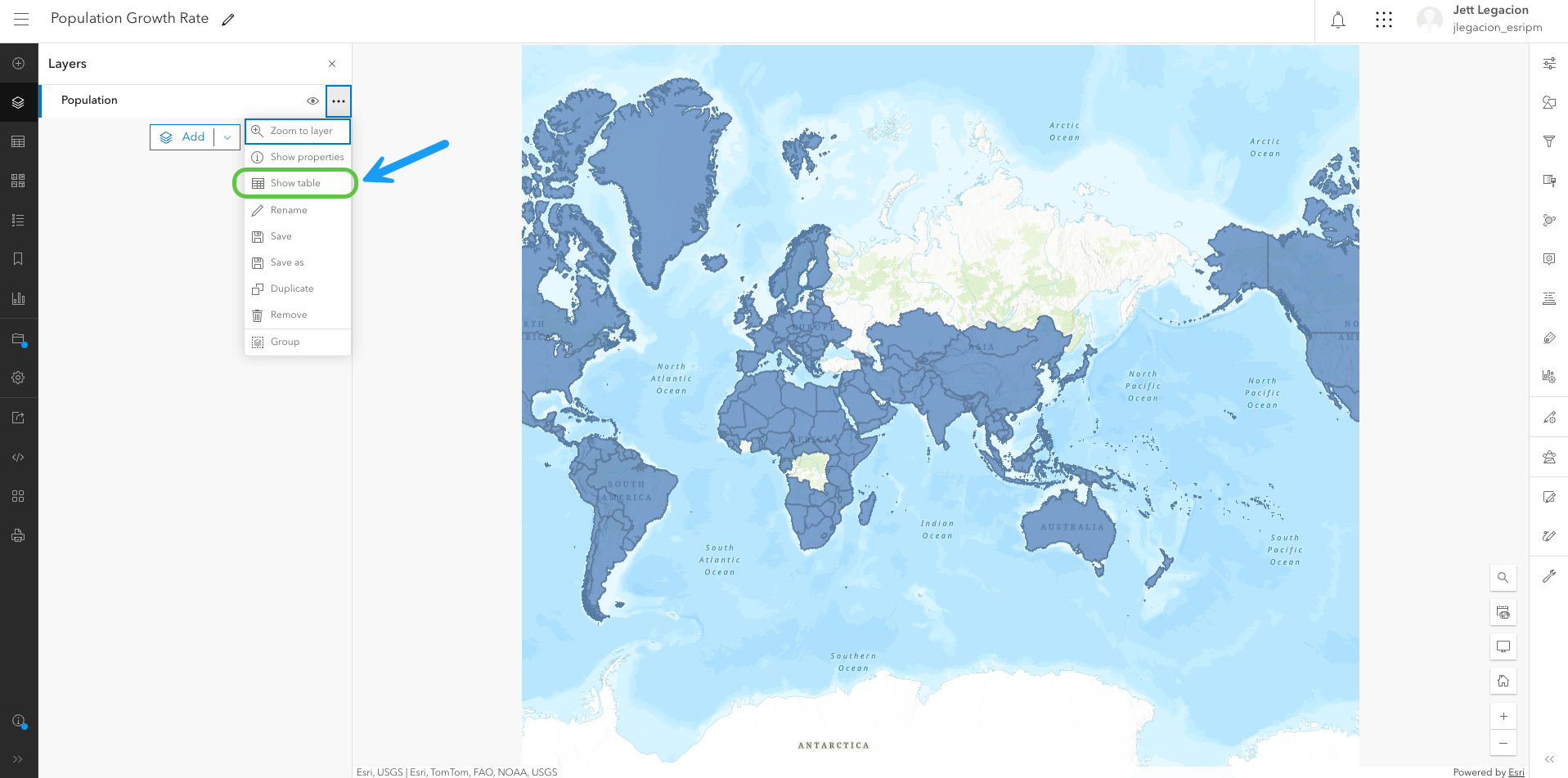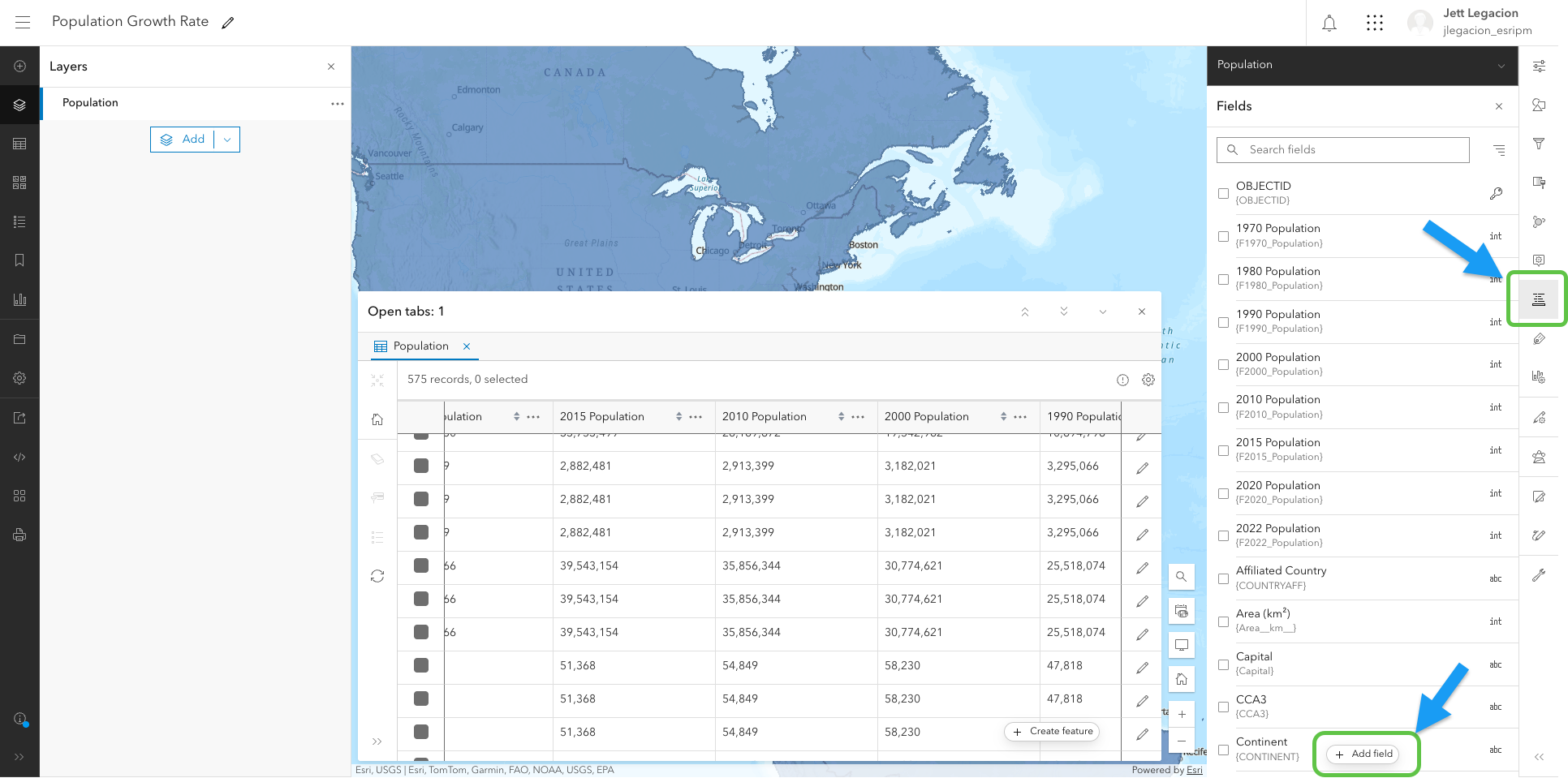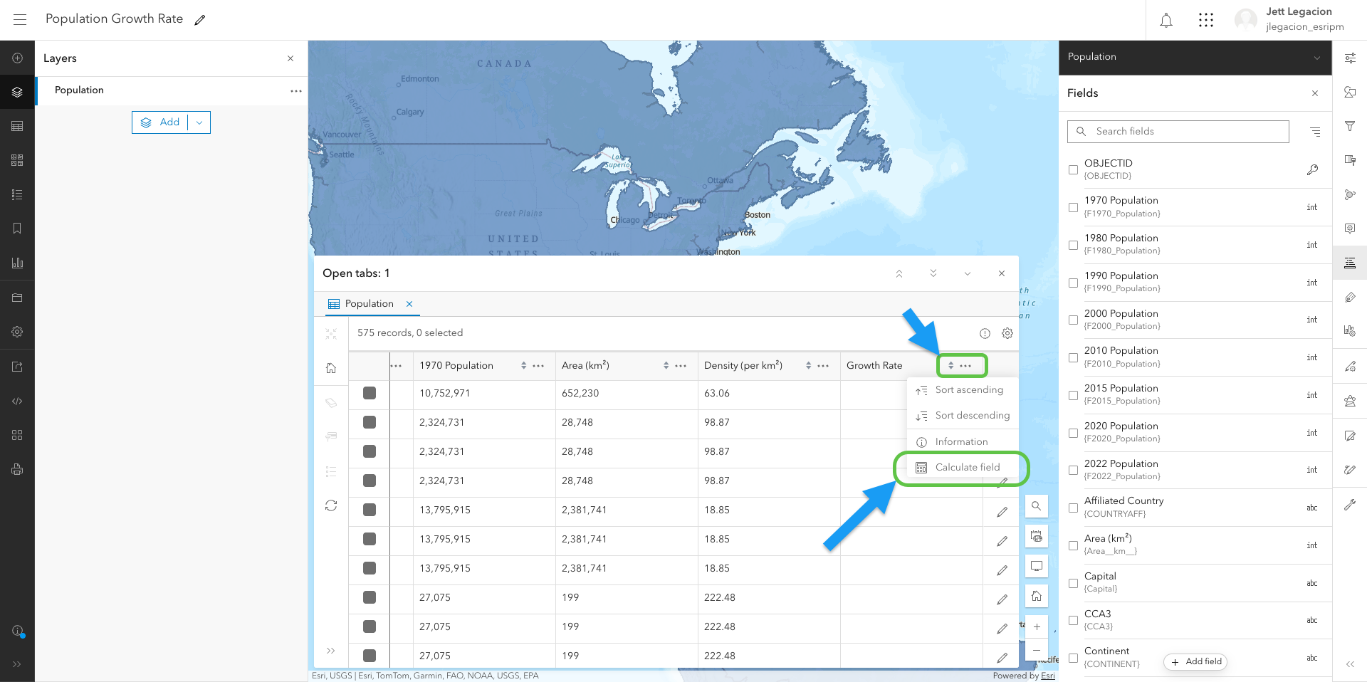 In Map Viewer, you have a world polygon layer that contains population data. This layer’s attribute table is where you will access the assistant to calculate fields. Let’s open up the table.