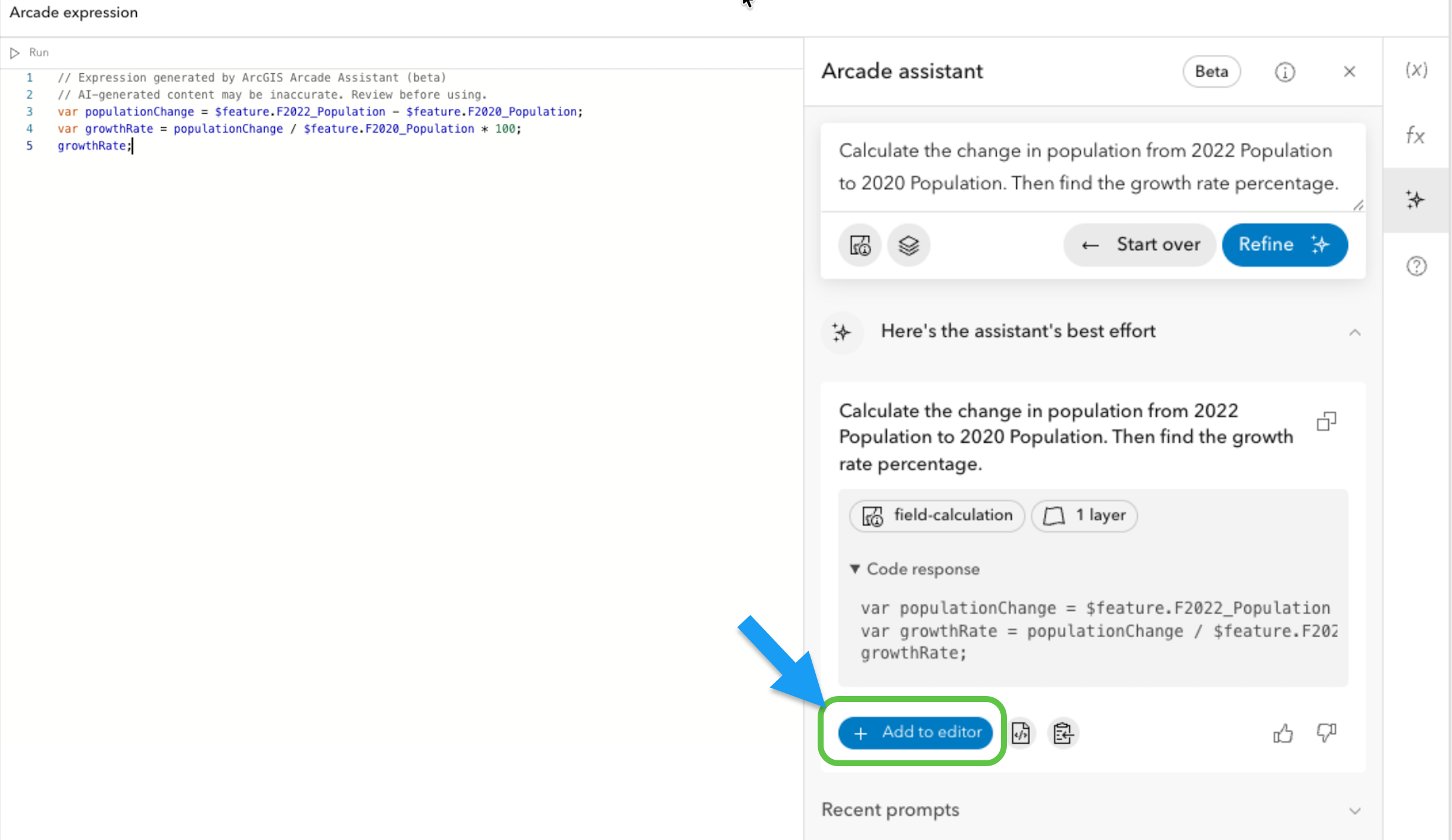 - Refer to the fields you want the assistant to reference by their actual names. For example, “2020 Population” and “2022 Population”)