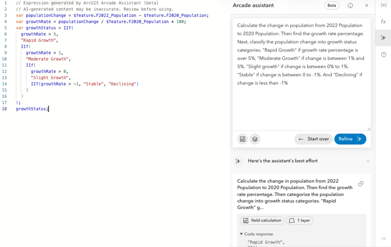 Approach: Use the assistant to generate Arcade expressions to help you calculate the growth rate. you can also ask the assistant to help you classify. More on this below.