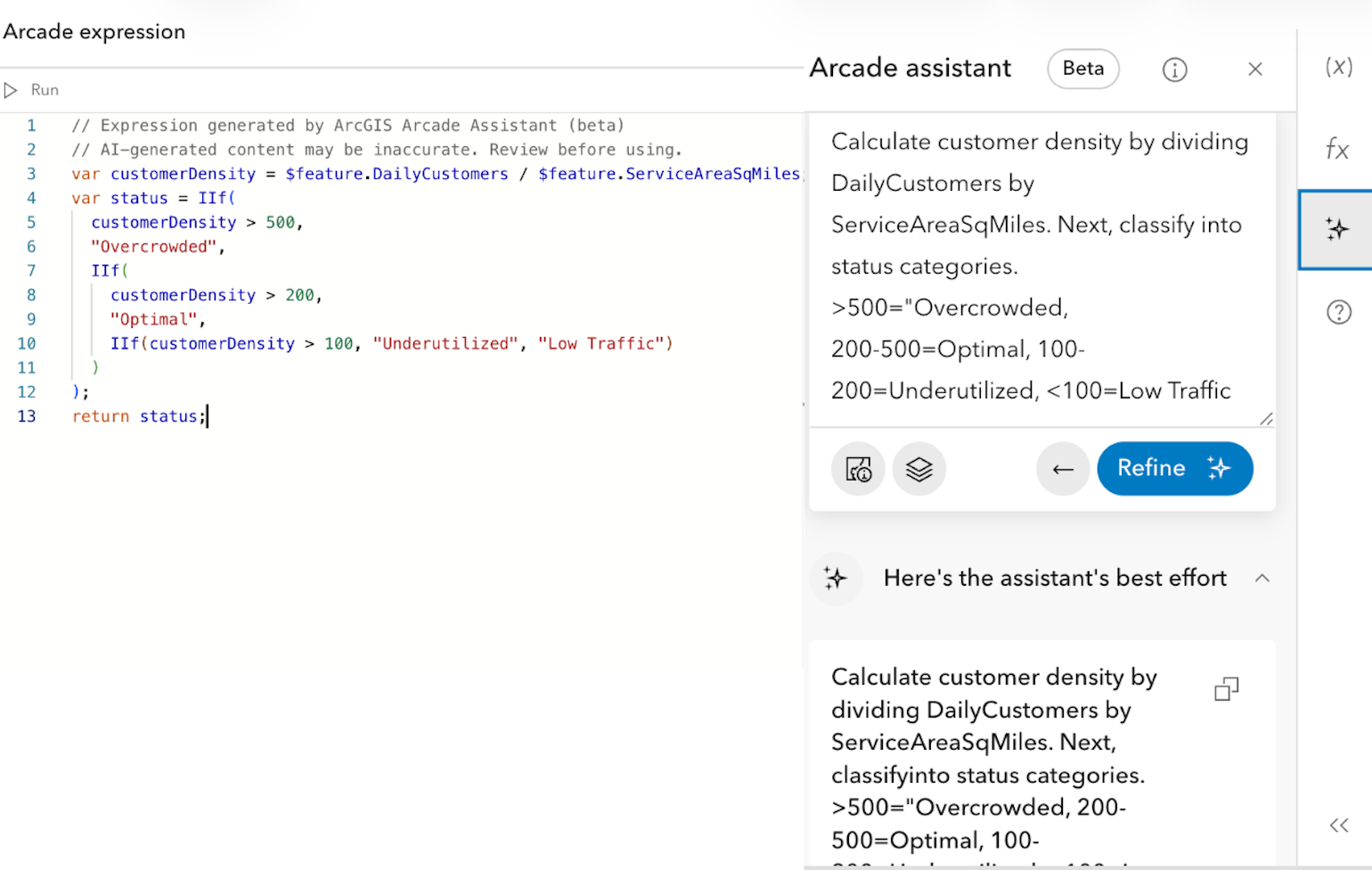 Approach: Use the assistant to generate Arcade expressions to help you calculate the customer densities of your units. You will also classify the results using a similar process to example 1.