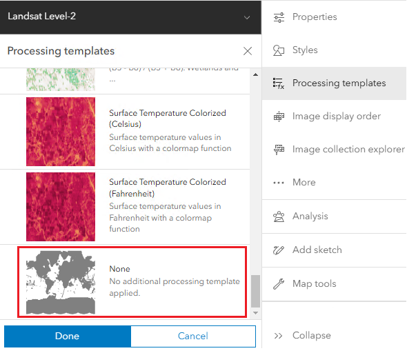 Before beginning your analysis, it is important to prepare the input layer to ensure all required bands can be accessed. The default processing template for the Landsat Level-2 layer is “Natural Color with DRA”, which selects a band combination of 4,3,2. You will need to prepare the Landsat imagery layer before conducting your analysis to be sure that all the bands are available for the analysis workflow.