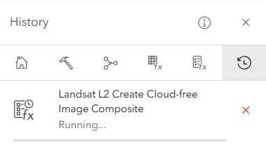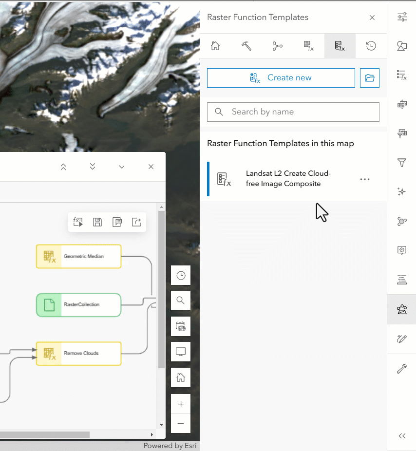 - Use the Browse Raster Function Template button to browse and select the item Create Cloud Free Image Composite with Landsat Level-2 in the Living Atlas, this will open the template in the Raster Function Editor, and simultaneously add it to the Raster Function Templates tab in Analysis pane.