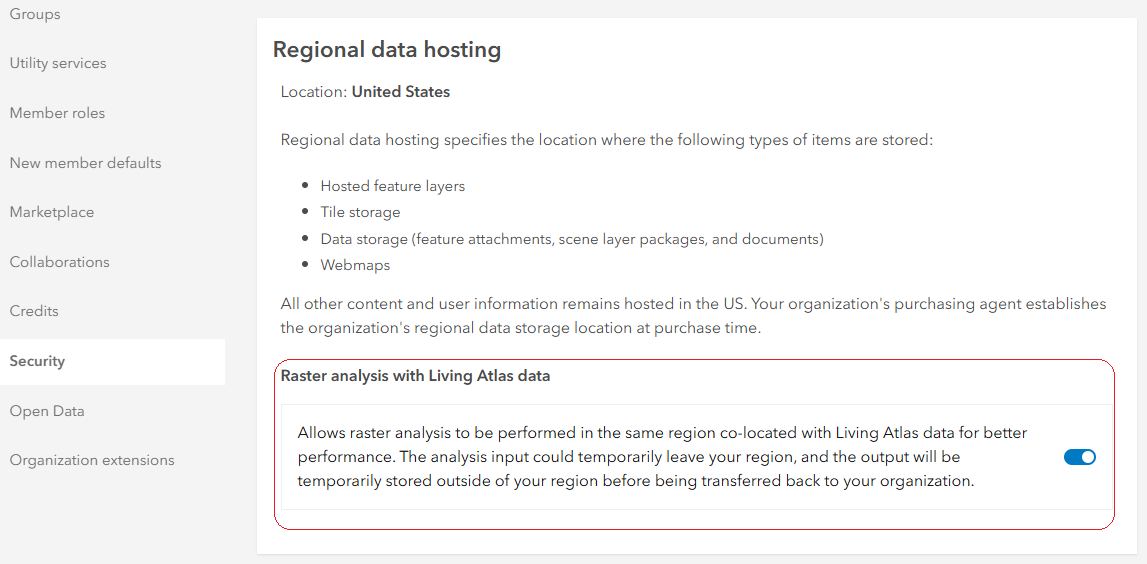 - Enable the option Allows raster analysis to be performed in the same region co-located with Living Atlas data for better performance. The analysis input could temporarily leave your region, and the output will be temporarily stored outside of your region before being transferred back to your organization.