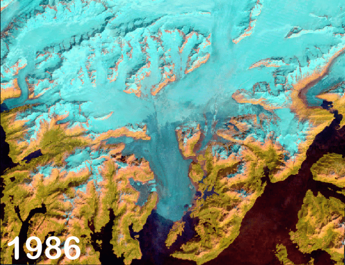 To highlight the glacier and distinguish the changes over the years, we can define the Red, Green and Blue bands to use Band 6 (Shortwave infrared 1), Band 5 (Near infrared), and Band 4 (Red).