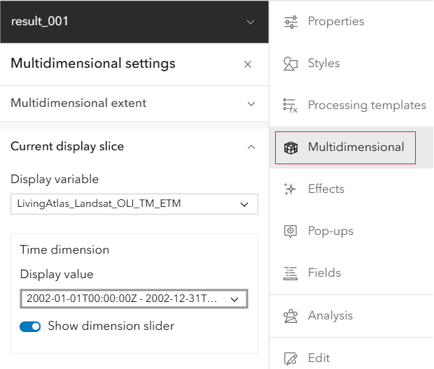 Once the processing is complete, a new multidimensional imagery layer is created with a yearly time interval. Through the Multidimensional pane, we can visualize the new layer by selecting a particular year or animate the imagery layer to see changes as it happens over time.