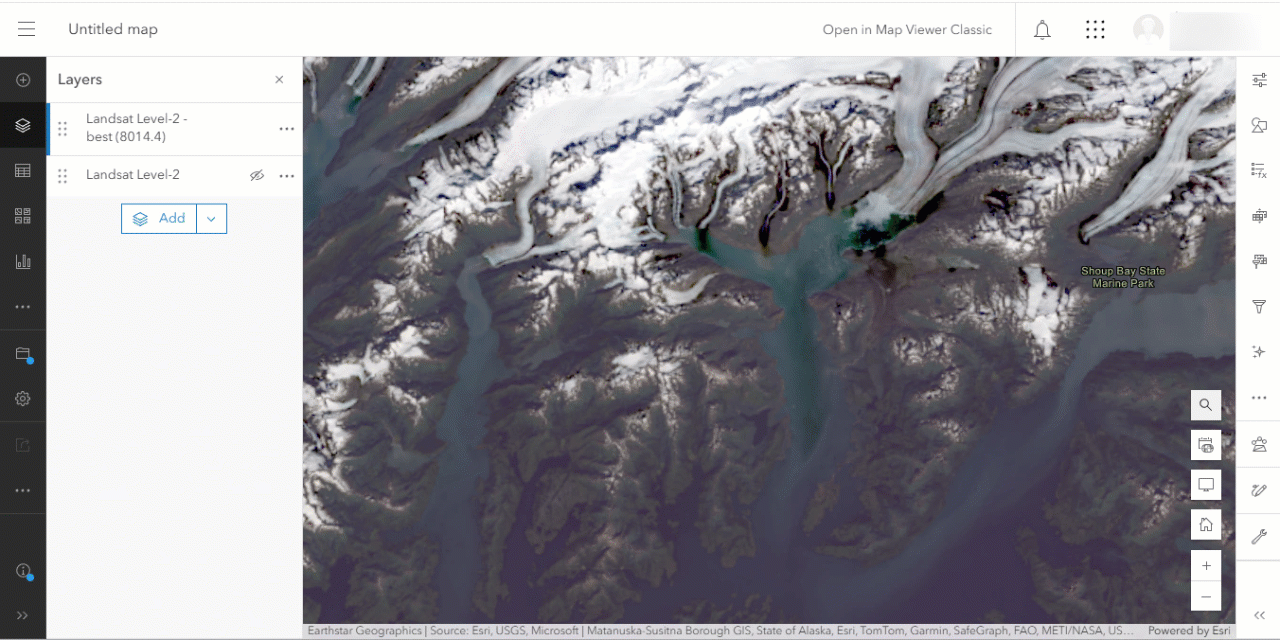 In the Map Viewer, search for “Landsat Level-2” through the Living Atlas and add this layer to the map. Because Landsat layer has the global coverage, this workflow can be used anywhere that have images available within your defined time period. We use Columbia Glacier in Alaska, USA as an example. It has long been an archetype of the world’s most rapidly changing glaciers. In the map, search by location and zoom to your area of interest.