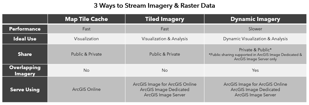Although map tile cache receives high marks for performance, please note that what you’re really streaming are “dumb” compressed image tiles. The rich information typically contained within imagery is lost. The tile caching process automatically saves your imagery as 8 bit and projects it to one projection– typically Web Mercator. What does this mean? Minimal analysis can be performed. A map tile cache doesn’t provide access to spectral bands, image metadata, or the ability to reproject the imagery. That said, if you need to empower stakeholders to do more with imagery than basic visualization, we recommend streaming tiled imagery or dynamic imagery layers.