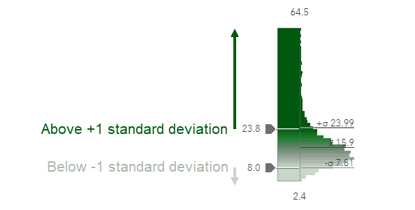 In the past, we were able to see the statistical average value of our data (x̄) labeled on the histogram, but now we can also see where +/- 1 standard deviation falls within our data’s histogram.