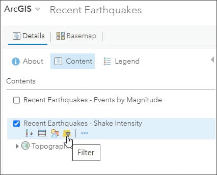 Step 6 — From the Layers pane, open the Recent Earthquakes group layer and select Shake Intensity.